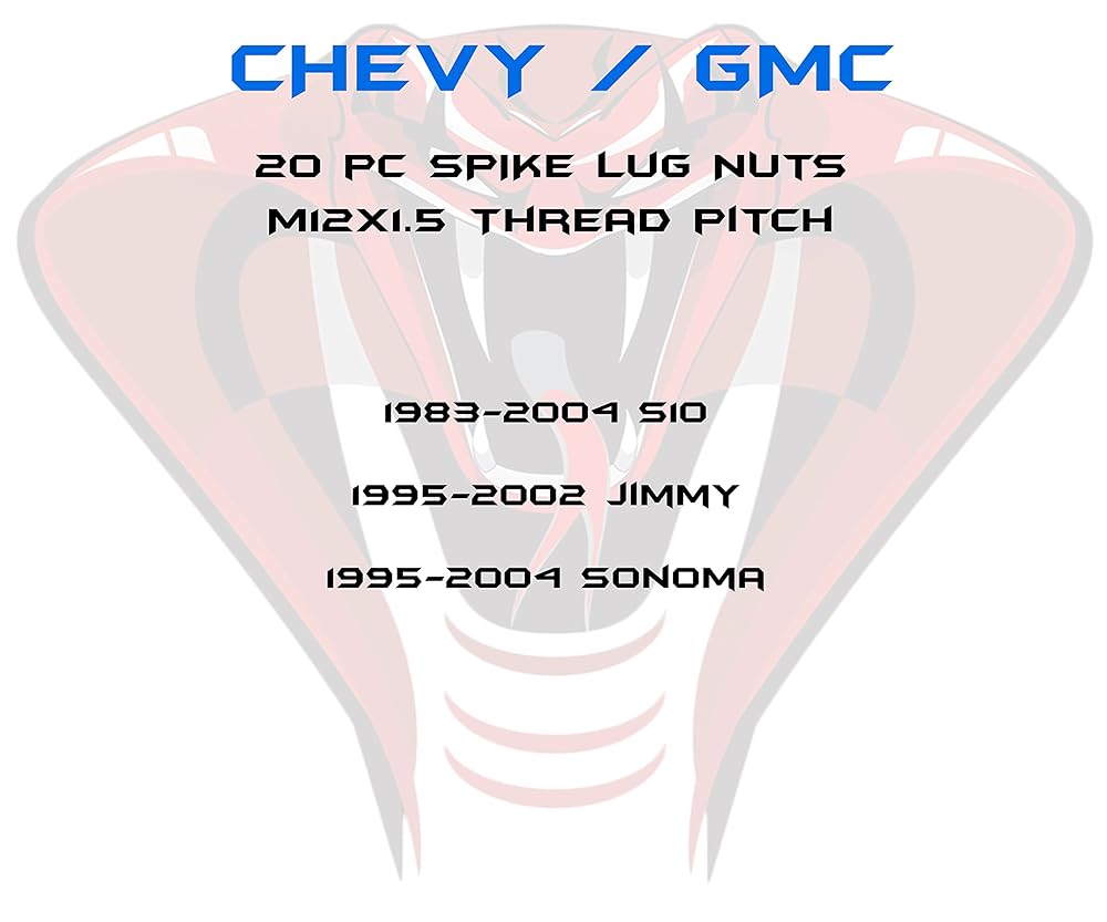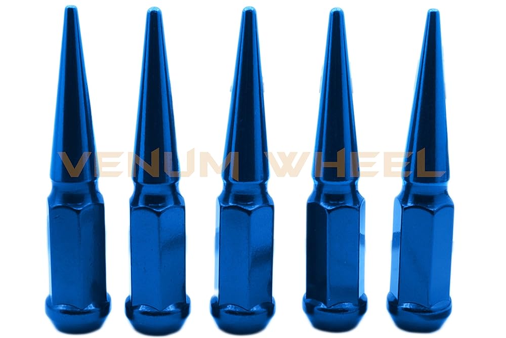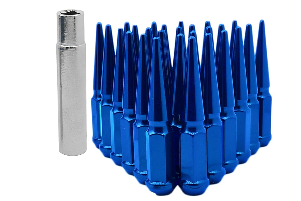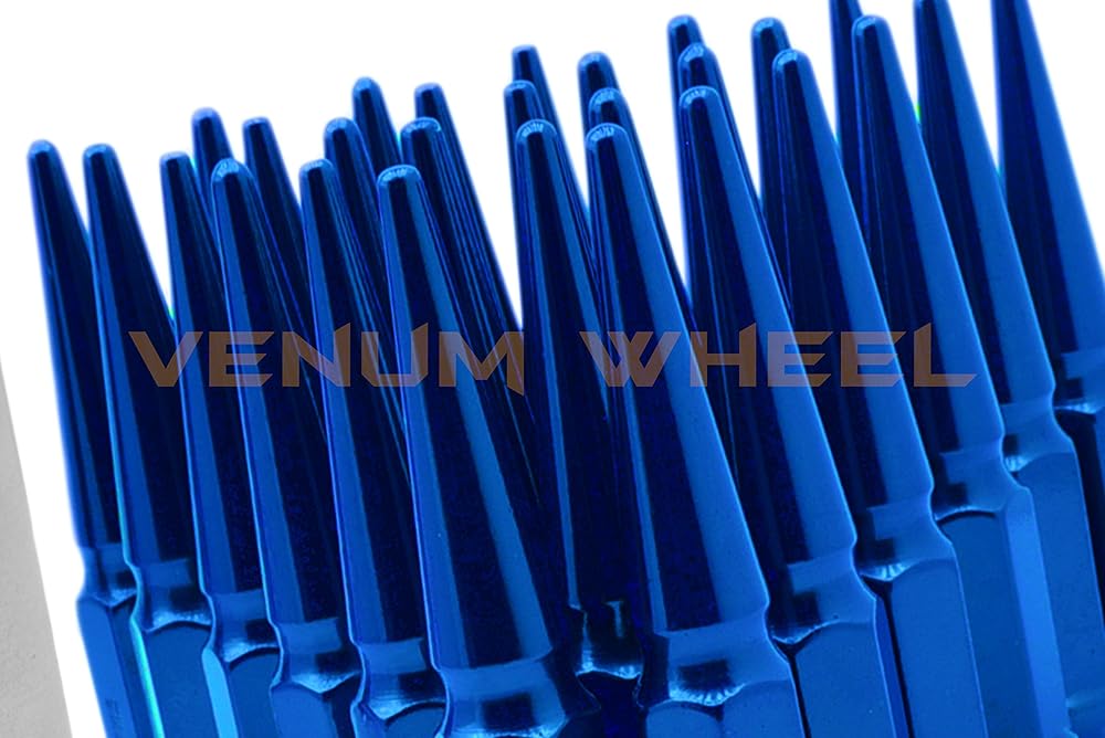 New 20 Pc Set of Blue " SOLID SPIKE" Metal Lug Nuts. Fits all 12x1.5 Trucks with aftermarket wheels & Conical seating. These lug nuts are better than our competition at a much better price. Spike Lug nuts are THE HOTTEST aftermarket lug nuts in the market. Made out of SCM 435 Cold Forged Steel, 1 Piece construction. These lug nuts require a special socket to install/remove them. At the same time it adds security to your wheels. Special key is included.