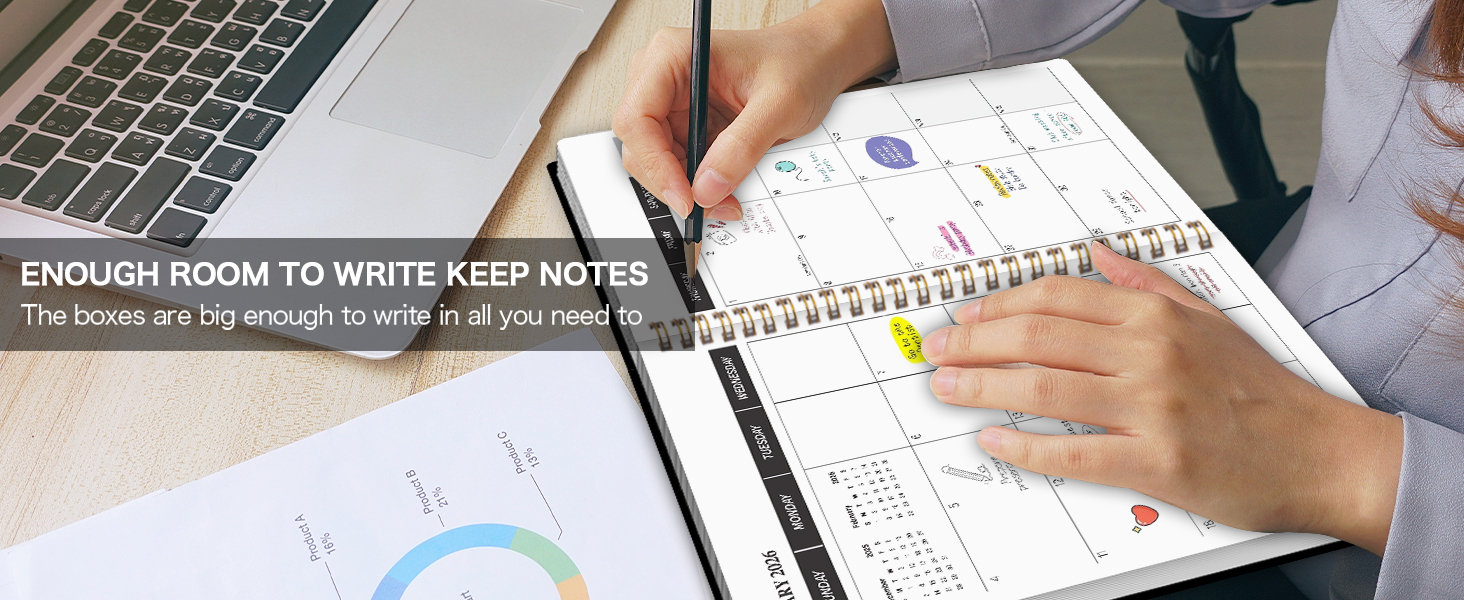 غطاء متين مقاوم للماء - يأتي المخطط الشهري 26-27 مزودًا بغطاء مقاوم للماء ومتين يحمي جميع الصفحات بداخله. يضمن الغطاء المتين بقاء المخطط الخاص بك سليمًا وفي حالة ممتازة، حتى خلال الأيام الأكثر ازدحامًا
