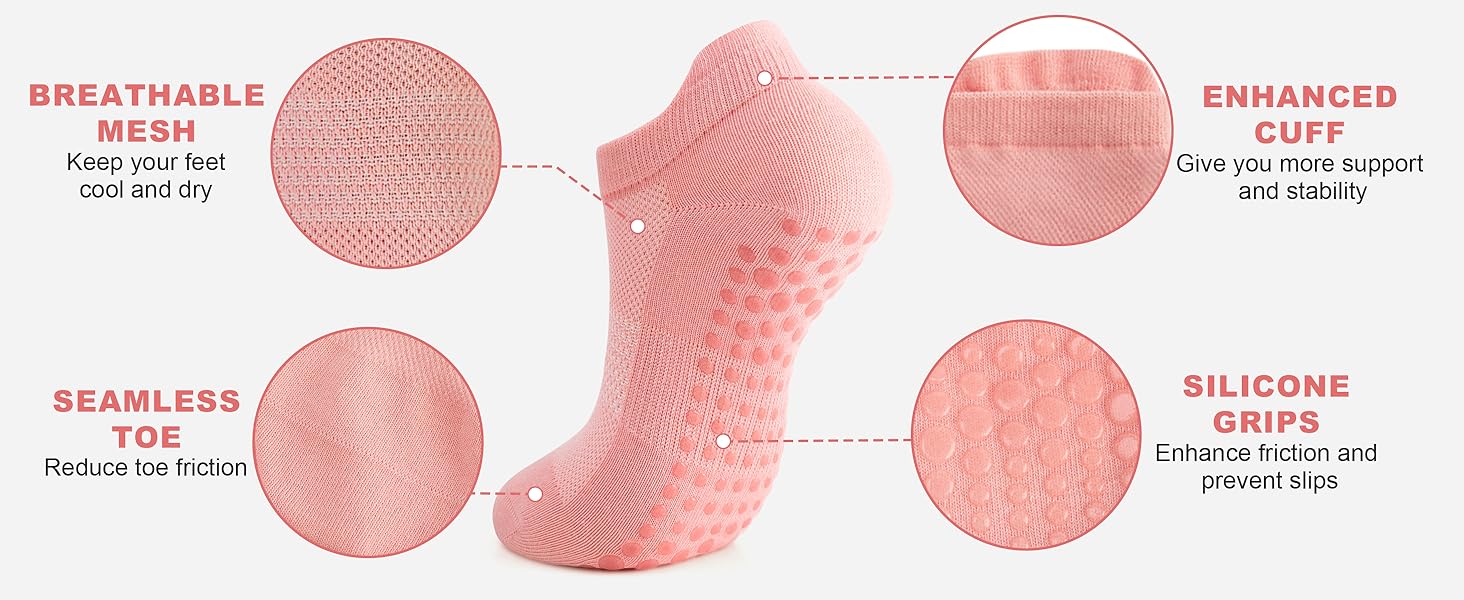 أقمشة مريحة: جوارب البيلاتس هذه مصنوعة من القطن والألياف لدنة فائقة الجودة، وهي مريحة ومسامية. مع شبكة حول مشط القدم، تمتص الأقمشة الفائقة العرق وتطلق العرق بسرعة، مما يحافظ على قدميك باردة وجافة طوال اليوم، دون أي شعور بالاحتكاك. تتميز جوارب اليوغا الخاصة بنا بالمرونة لتوفير ملاءمة مريحة، وتعانق قدميك بلطف وتضمن بقاء قدميك مرتاحة.