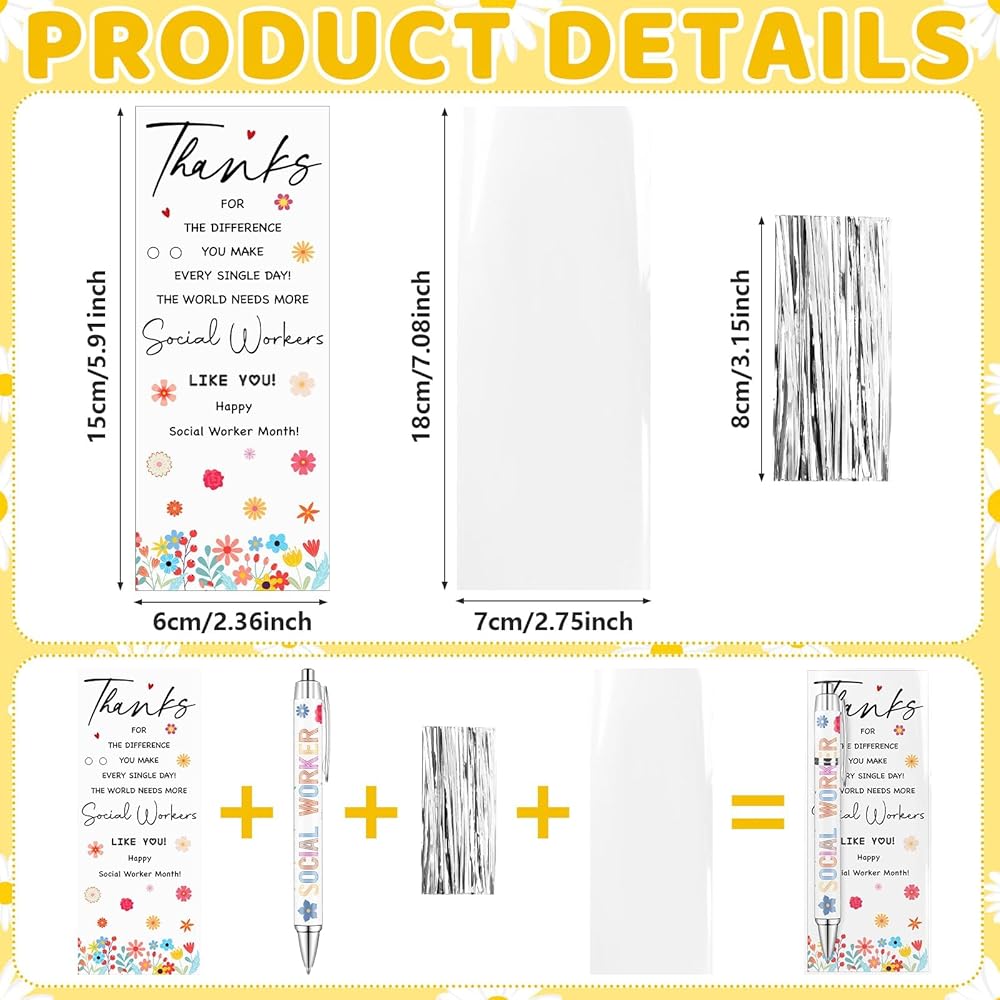 • Thoughtful Size, Comfortable Writing: our colorful social workers pens are sized at about 5.43 inches/ 13.8 cm, easy to hold and write; And the social worker appreciation cards are about 5.91 x 2.36 inches/ 15 x 6 cm, portable and compact. You can use a cable tie to assemble the pen and card into an opp bag to form a beautiful gift combination, convenient for storage and giving away; Perfect for meaningful events such as social work month gifts, social worker appreciation gifts