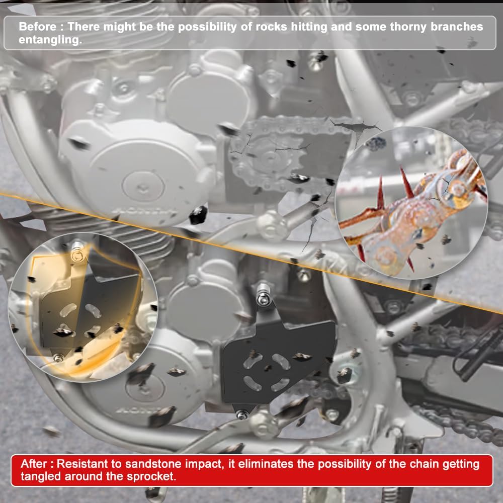• ADVANTAGE: By shielding the front sprocket from rain, mud, and oil splatter, the guard minimizes rust and grime buildup, reducing the need for frequent cleaning and lubrication