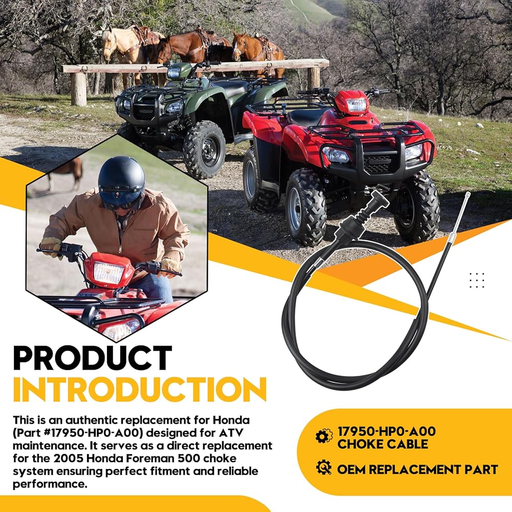 Genuine for Honda Replacement Part: This is an authentic replacement for Honda (Part #17950-HP0-A00) designed for ATV maintenance. It serves as a direct replacement for the 2005 Honda Foreman 500 choke system, ensuring perfect fitment and reliable performance. While designed specifically for Honda models, it also functions as a versatile universal choke cable suitable for various applications. A must-have for Honda Foreman 500 accessory for optimal engine operation.