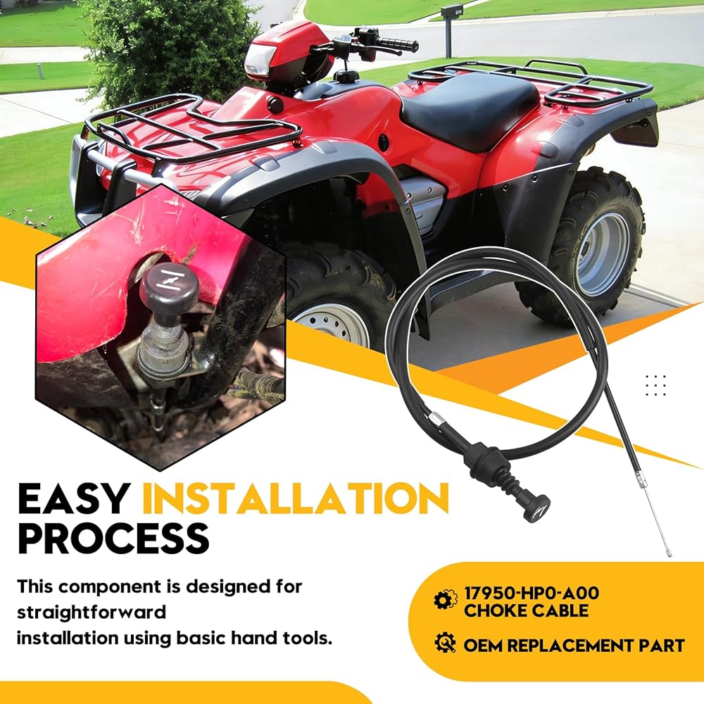 Genuine for Honda Replacement Part: This is an authentic for Honda component (Part #17950-HP0-A00) designed specifically for ATV maintenance. It serves as a direct replacement for the 2005 Honda Foreman 500 chokesystem, ensuring perfect fitment and reliable performance as an essential replacement for Honda Foreman 500 accessory. Precise Model Compatibility: Engineered for 2005-2011 Honda Foreman 500S & 500ES models in both 2WD and 4X4 configurations. This choke cable for Honda 500 is specifically designed for the TRX500 platform, making it a crucial component for Honda Foreman 500 maintenance. Essential Choke System Operation: Provides reliable control of the choke mechanism for smooth cold starts. This cable choke component connects directly to Honda Foreman 500 choke plunger, working seamlessly with the engine system to ensure proper starting functionality in various weather conditions. Direct OEM Specification: Manufactured to Honda's exact engineering standards, this genuine for Honda part delivers the same quality and performance as the original equipment. It precisely replaces for 2005 Honda Foreman, maintaining optimal engine performance. Easy Installation Process: This component is designed for straightforward installation using basic hand tools. The simplified design enables quick replacement without requiring specialized mechanical knowledge, allowing for quick restoration of proper choke function with minimal effort.
