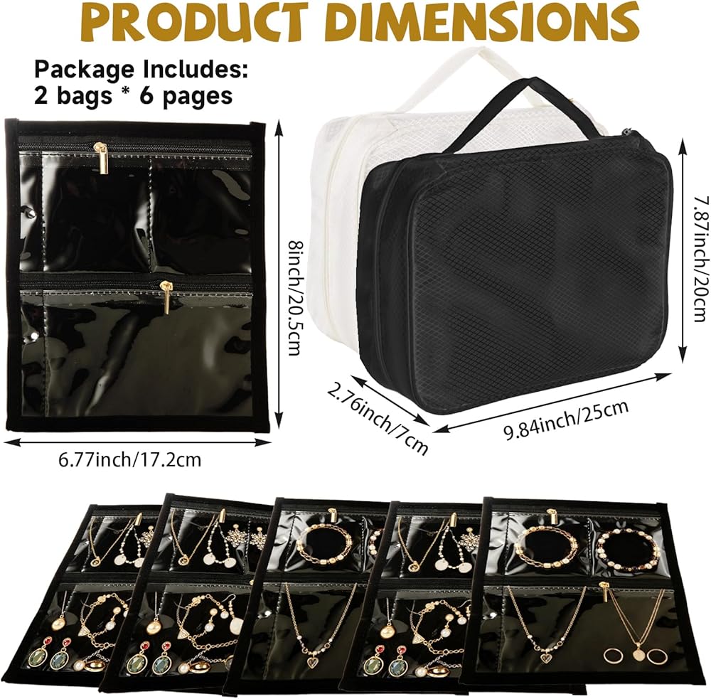 2.This stylish set includes a beige and a black jewelry binder, each equipped with six clear zipper velvet pouches, ideal for storing earrings, rings, necklaces, bracelets, and watches.