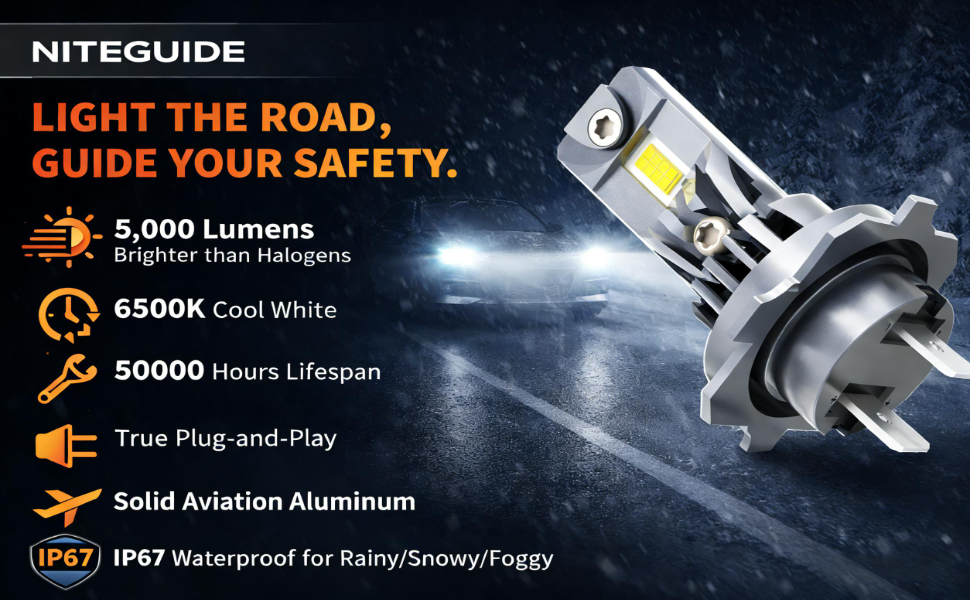 • سطوع استثنائي: ما يصل إلى 5000 لومن لكل مجموعة عند 6500 كلفن يوفر شعاعًا أبيضًا واضحًا بدون بقع داكنة أو وهج. يعمل على تحسين الرؤية الليلية ووقت رد الفعل على الطرق المظلمة أو غير المضاءة دون إعاقة حركة المرور القادمة.