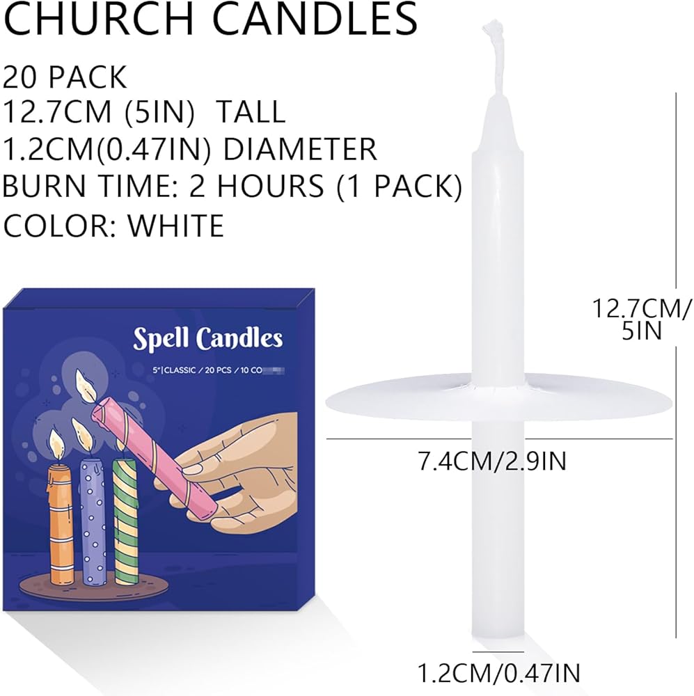 20 premium 5-inch taper candles with 3-inch drip catchers - perfect for church services, candlelight vigils & emergencies. Features 100% cotton lead-free wicks for clean, smokeless burns. Unscented white candles with heavy-duty glossy protectors prevent wax spills. Ideal for prayer, Shabbat & spiritual rituals. Bulk value pack for extended use. (Note: Holders not included)