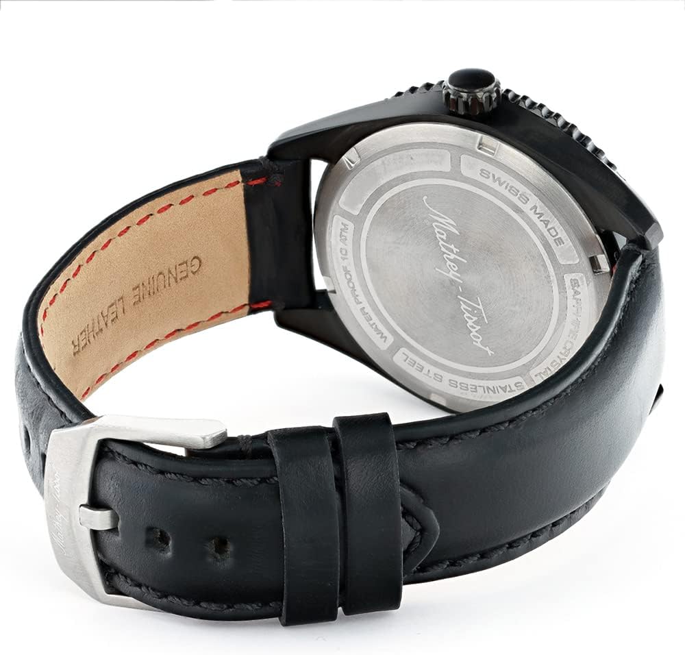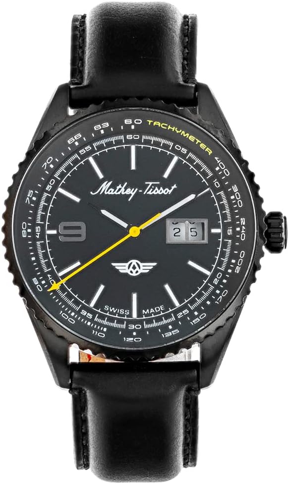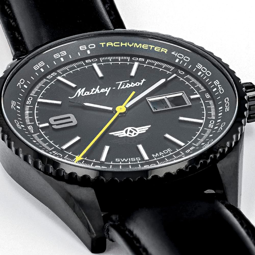 ساعة ماثي تيسوت أطلس كوليكشن للرجال بعرض تاريخي بثلاثة عقارب - هيكل أسود من الفولاذ المقاوم للصدأ مقاس 43 ملم، مينا سوداء مع عداد سرعة ونافذة للتاريخ، تصميم التراث السويسري مع حزام جلدي