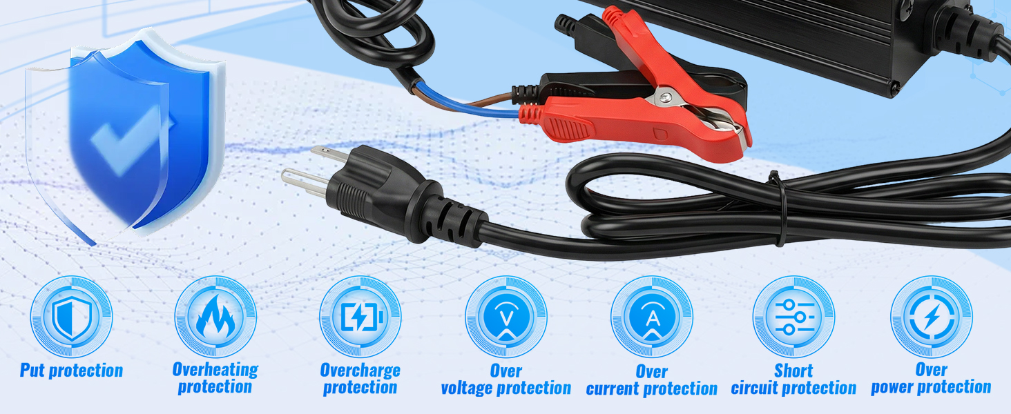 الحماية الشاملة المتعددة والشهادات الدولية: السلامة تأتي أولاً. تم تجهيز شاحن بطارية الليثيوم 12 فولت هذا بميزة الشحن الزائد والحرارة الزائدة وحماية الدائرة القصيرة لحماية البطاريات والمناطق المحيطة بك أثناء التشغيل. معتمد بالكامل من UL وCE وFCC وROHS، يمكنك الطلب بثقة مع العلم أنك تحصل على منتج تم اختباره واعتماده بشكل احترافي.