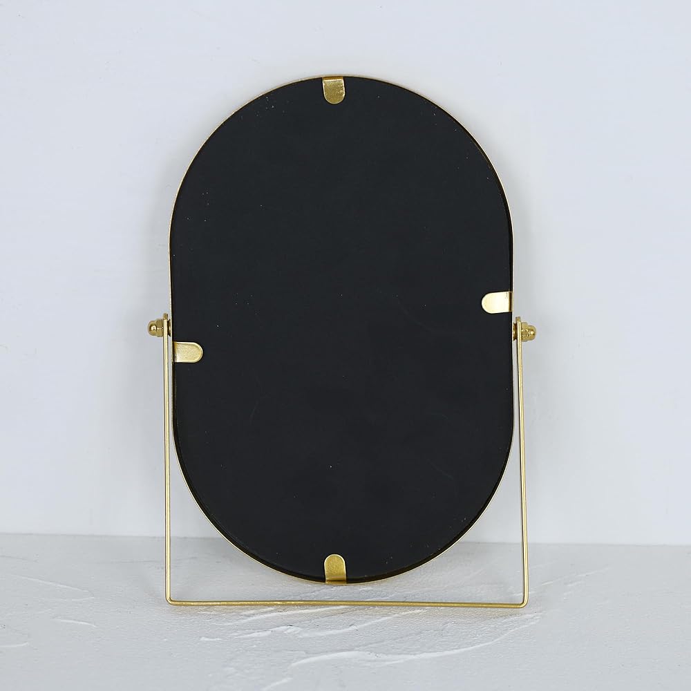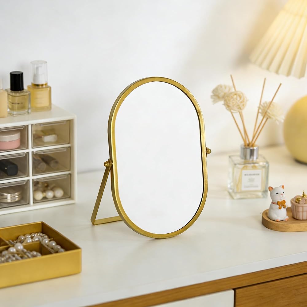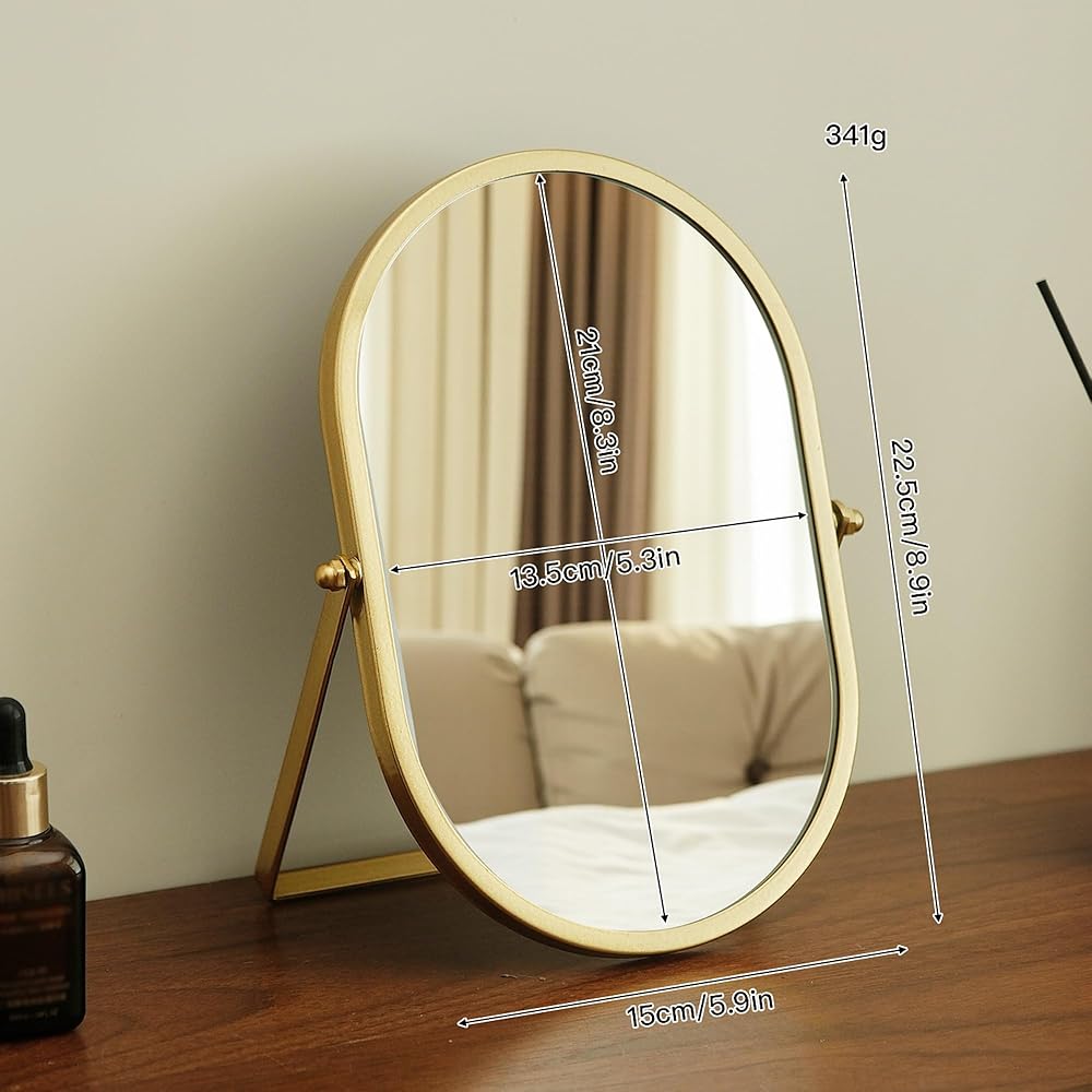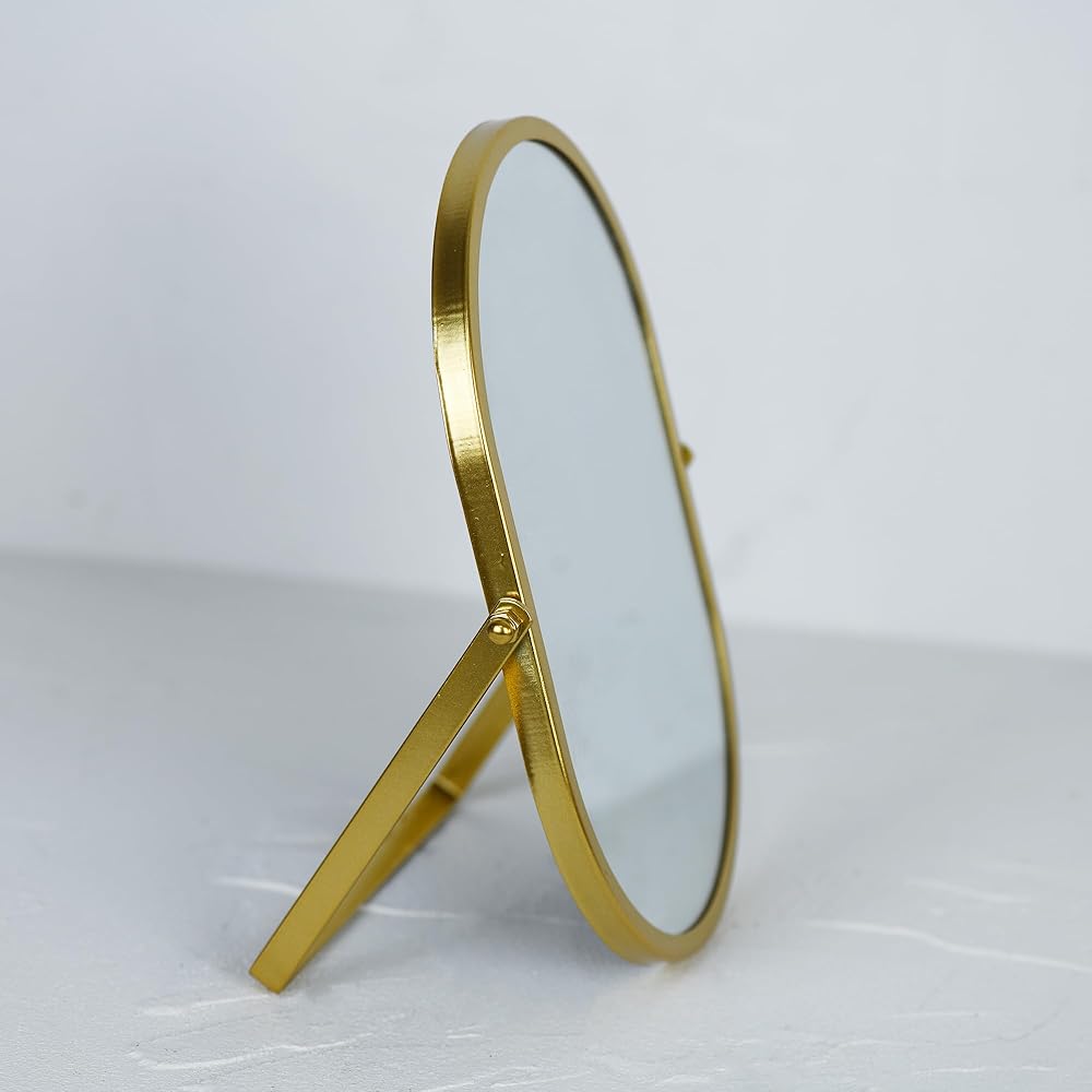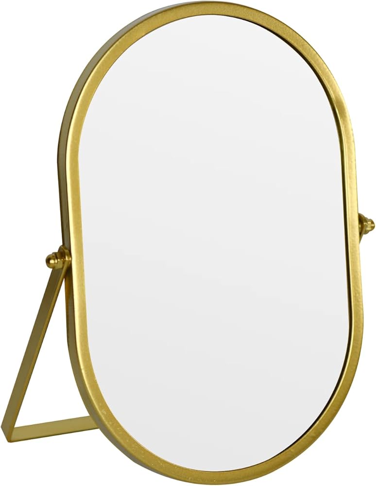 This elegant oval vanity mirror features a sophisticated gold metal frame that adds a touch of luxury to any bedroom, bathroom, or dressing area. The tabletop design with sturdy stand provides perfect stability for daily grooming routines and makeup application. Measuring approximately 10.4 inches wide by 7.1 inches tall, this compact mirror offers an ideal size for personal use while fitting comfortably on vanities, dressers, or bathroom counters. The high-quality reflective surface delivers crystal-clear visibility for precise makeup application and skincare routines. The timeless oval shape and premium gold finish complement both modern and traditional decor styles, making it a versatile addition to your beauty space. The adjustable stand allows you to position the mirror at your preferred angle for optimal viewing.