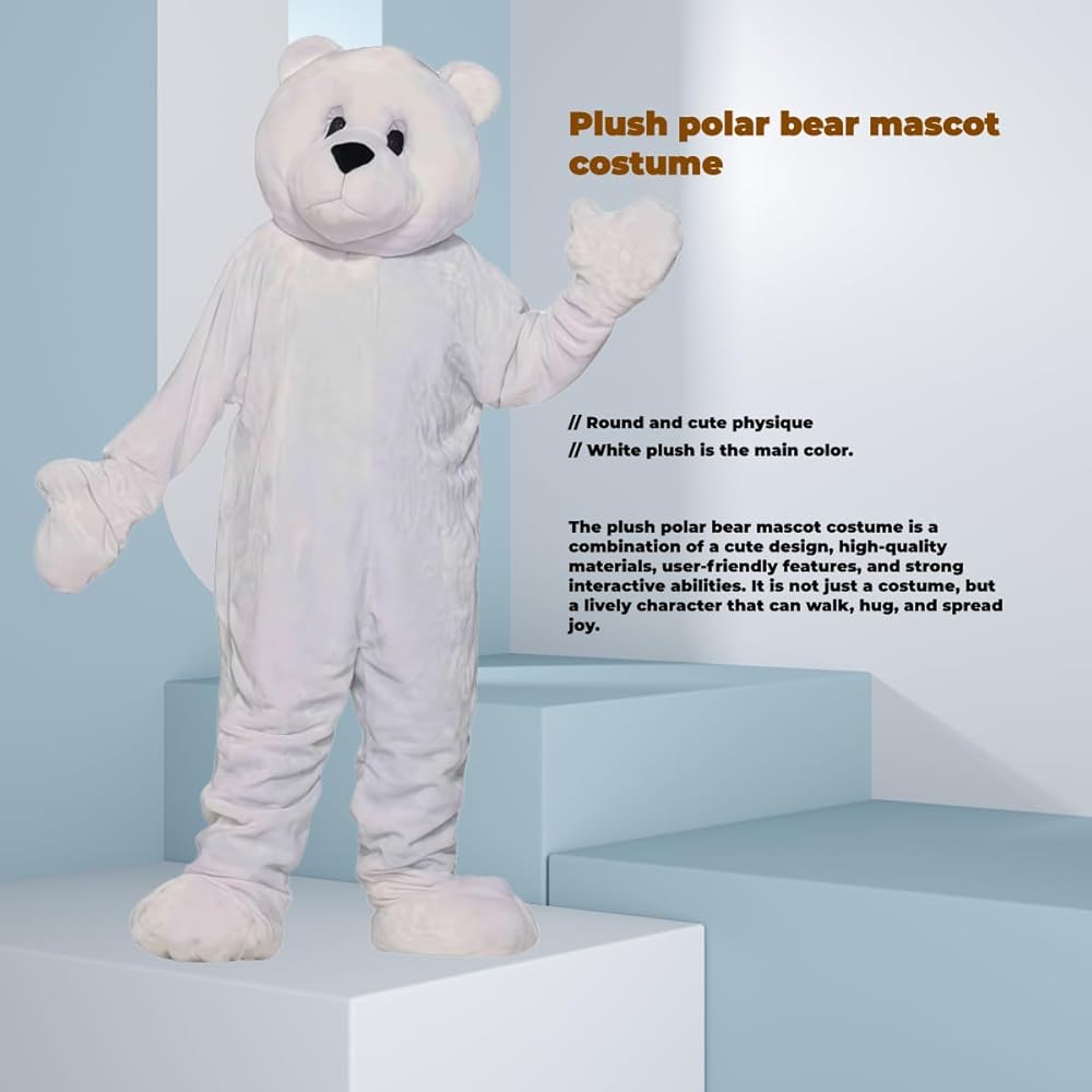 Polar bear Costume is made from fluffy short-pile fabric and features three dimensional tailoring, creating a plump and endearing teddy bear shape. Thoughtfully designed playful round ears, a three dimensional nose, and a smiling mouth come together to form its cute and charming expression. Whether for themed parties, holiday celebrations, or commercial events, it allows you to maintain adult composure while fully embracing childlike innocence and fun, becoming a beloved 'party bear' wherever you go