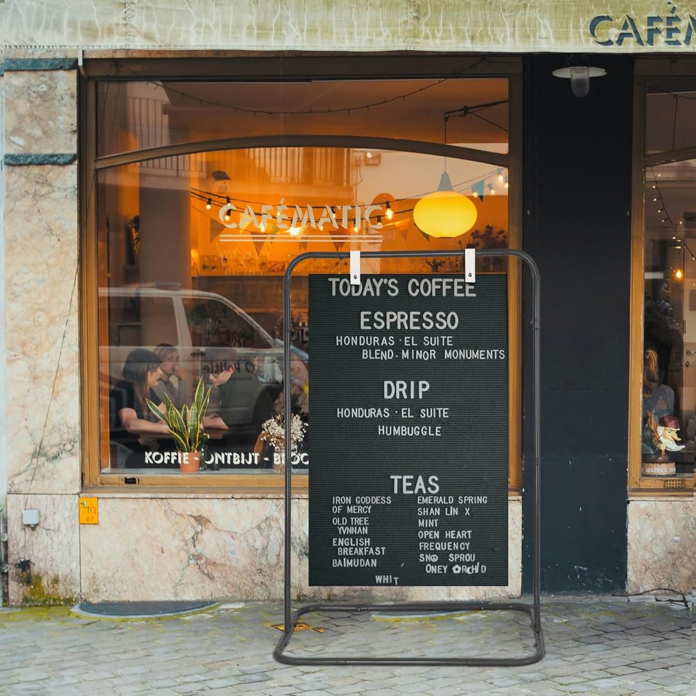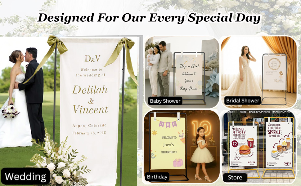 مصممة لتحمل العناصر: حوامل العرض الخاصة بنا مصنوعة من حديد عالي التحمل، ومصممة لتحمل المطر غير المتوقع أو أشعة الشمس القاسية. بفضل قاعدته العريضة والمستقرة، يمكنك الاطمئنان إلى أن حامل لافتة الترحيب الخاص بك سيبقى آمنًا ومستقيمًا، بغض النظر عن ظروف الطقس، مما يضمن انتهاء مناسبتك دون أي عوائق.