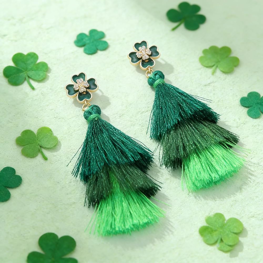 Festive St. Patrick's Day Design: Elevate your holiday outfit with these vibrant green tassel earrings. Featuring a classic lucky clover (shamrock) stud top paired with three tiers of ombre green fringes, they capture the perfect "Luck of the Irish" spirit. These cute earrings are the ultimate accessory to show your festive side and avoid getting pinched!