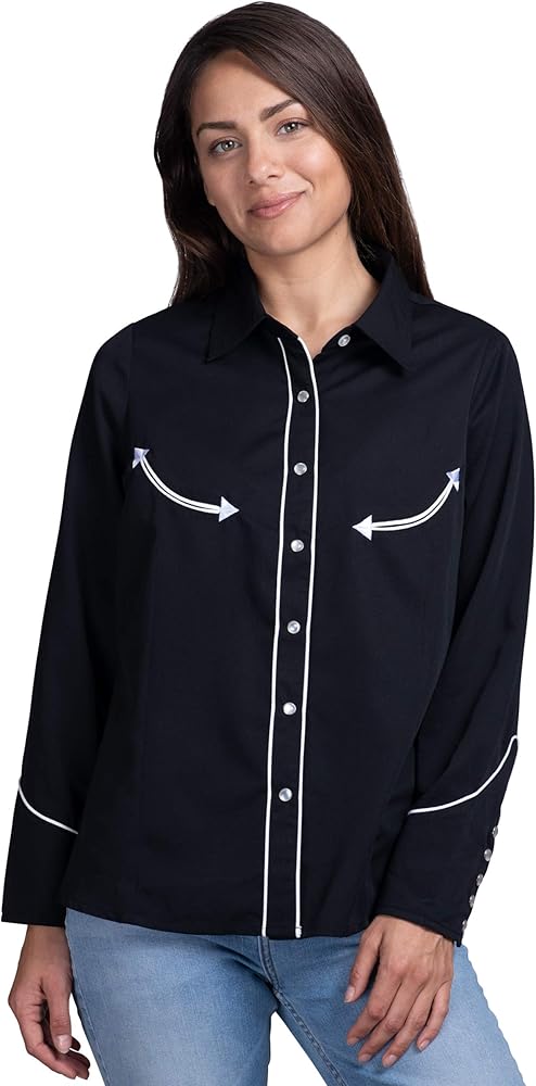 This black women's western shirt by Benny's features gabardine fabric and embroidered smile pockets. As a size reference, Lucia is 5" 5" tall, 110 lbs, and is wearing size S.