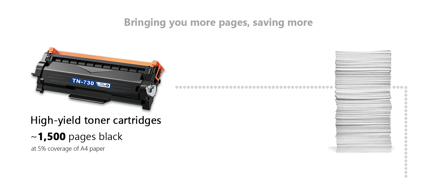 • 【إنتاجية الصفحة】: 1,500 صفحة لكل خرطوشة حبر TN-730 (بتغطية 5% من ورق A4)