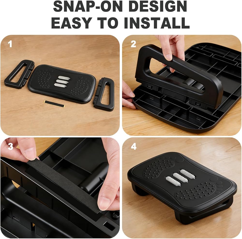 • استمتع براحة فورية مع تصميمنا السهل التركيب والخالي من الأدوات. قم بتجميع مسند قدمك الجديد في أقل من دقيقة - دون الحاجة إلى براغي أو أدوات. يضمن نظام الاتصال البديهي الخاص به ملاءمة آمنة بمجرد إخراج الجهاز من العلبة، مما يتيح لك الانتقال من فتح العلبة إلى الدعم المريح على الفور تقريبًا.