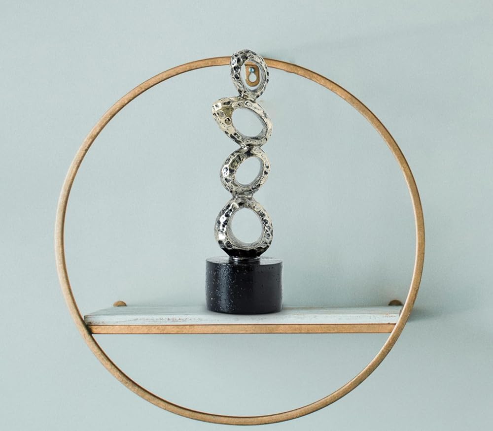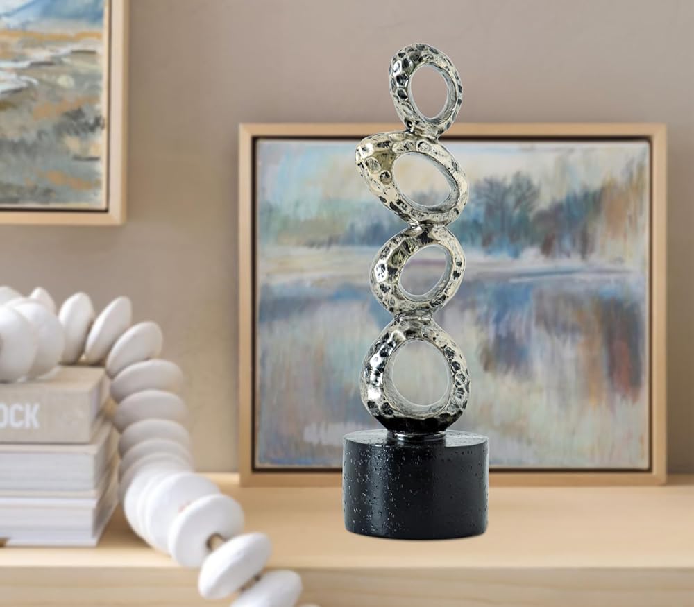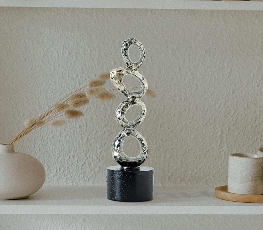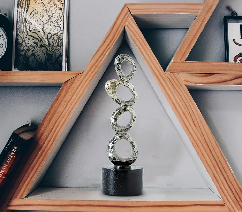 Unique Abstract Design: Featuring 4 artistic irregular abstract gold egg-shaped rings, this sculpture adds a modern touch to any space, enhancing shelves, desktops, and mantles with its contemporary appeal.