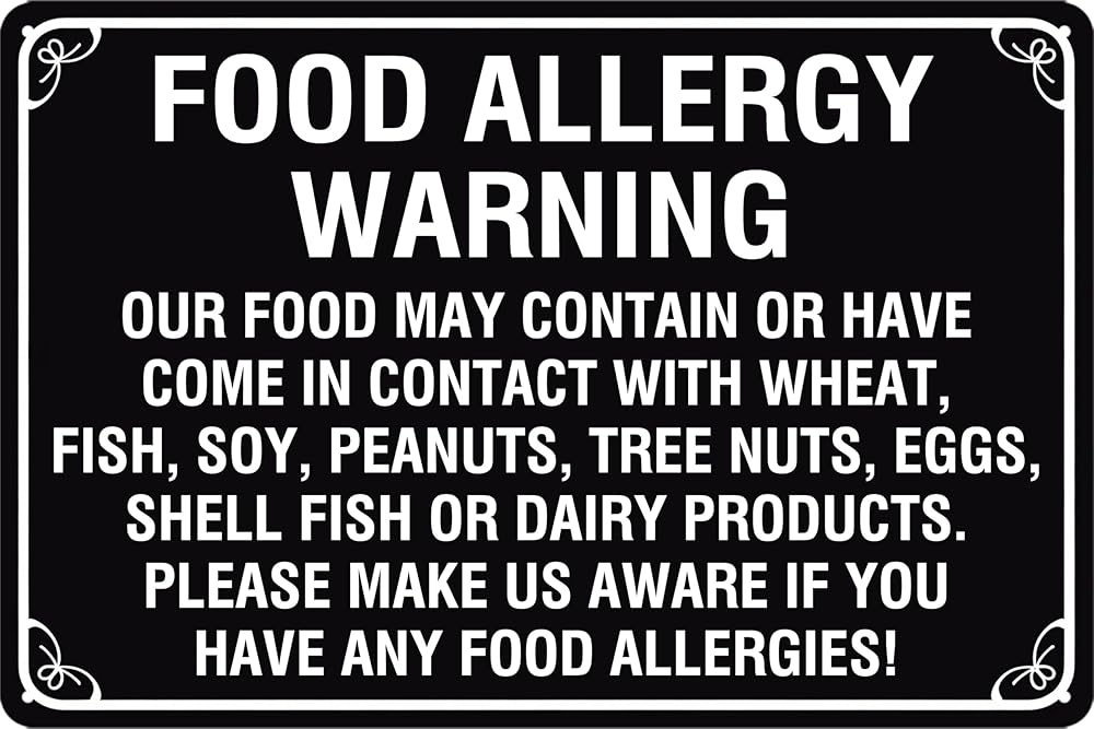 علامة تحذير من حساسية الطعام، لافتات مطاعم آمنة، علامات شاحنة الطعام، مشكلة جيدة مسببات الحساسية، ملصق معدني من القصدير، علامة إشعار حساسية الطعام، 8 × 12 بوصة