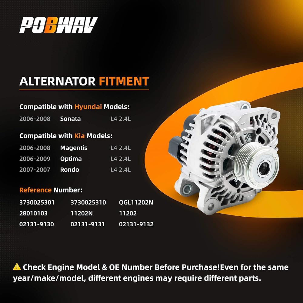 【المركبات المتوافقة: مولد POBWAV 3730025310 متوافق مع 2006 2007 2008 Hyundai Sonata 2.4L L4؛ متوافق مع 2006 2007 2008 Kia Magentis 2.4L L4,2006 2007 2008 2009 Kia Optima 2.4L L4,2007 كيا روندو 2.4L L4.