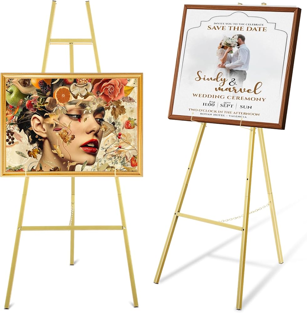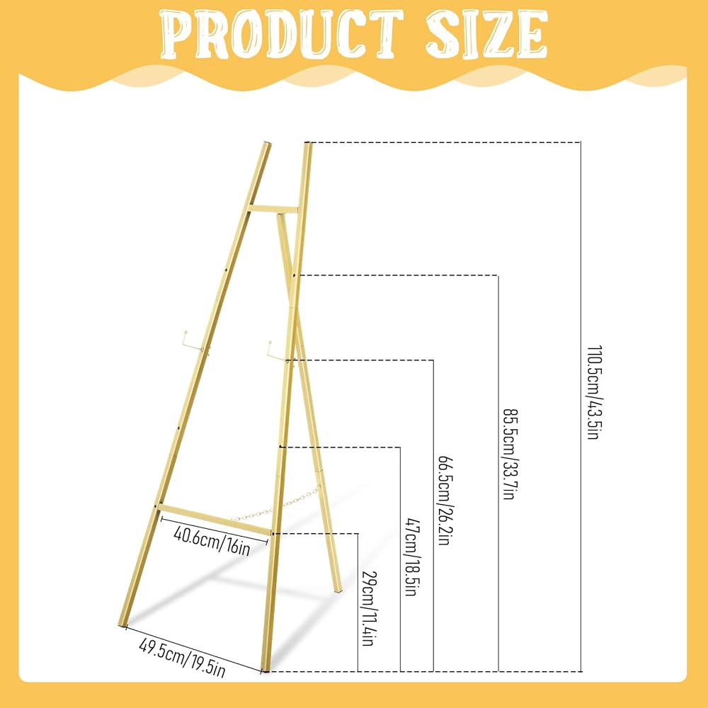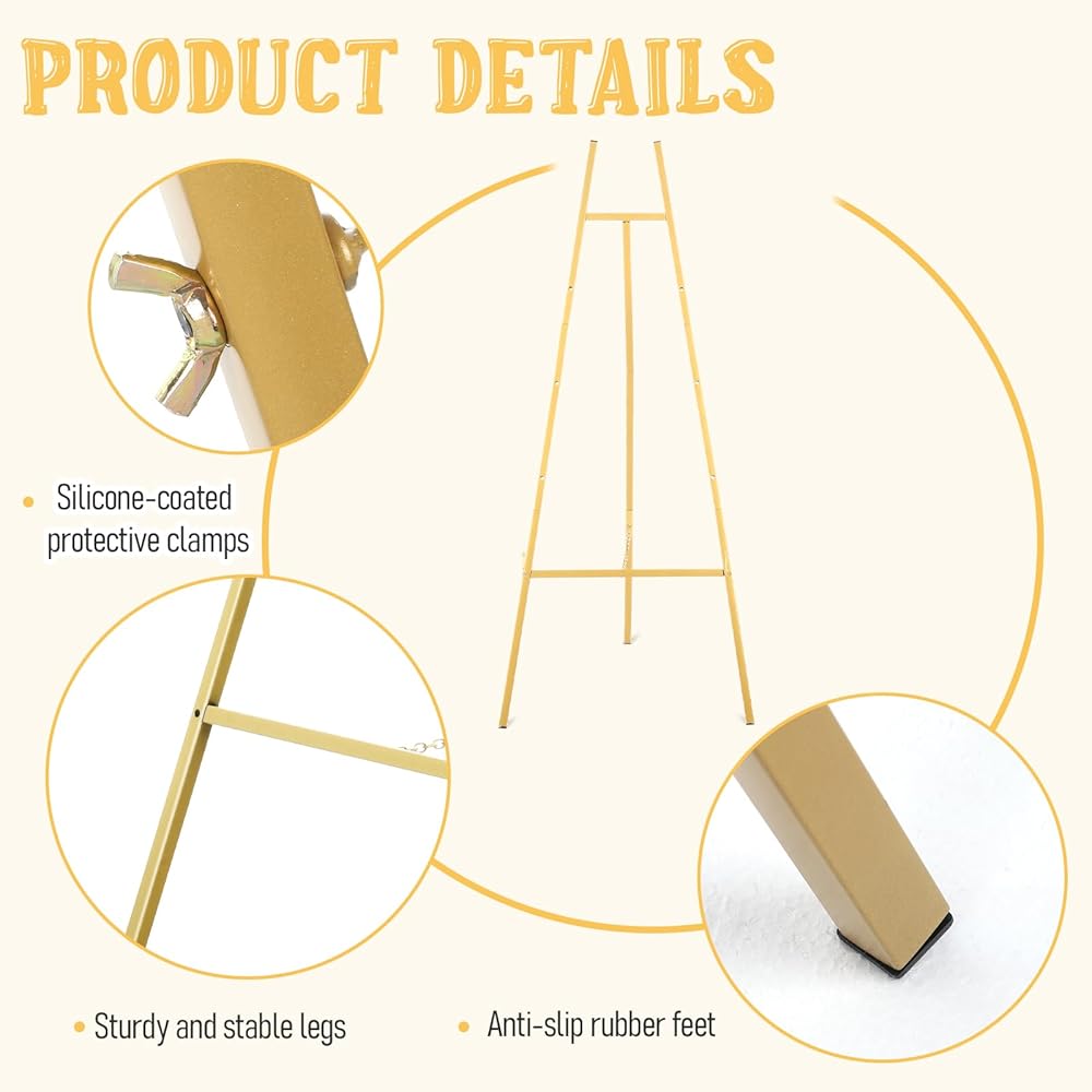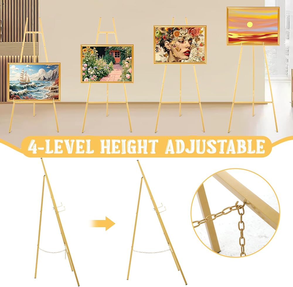 • 【4-Level Adjustable Design】 Our gold easel stand features a tripod construction that offers 4 adjustable height holes that can be adjusted painting, poster and wedding sign height by rotating adjustment knobs, to meet a variety of painting and display needs.
