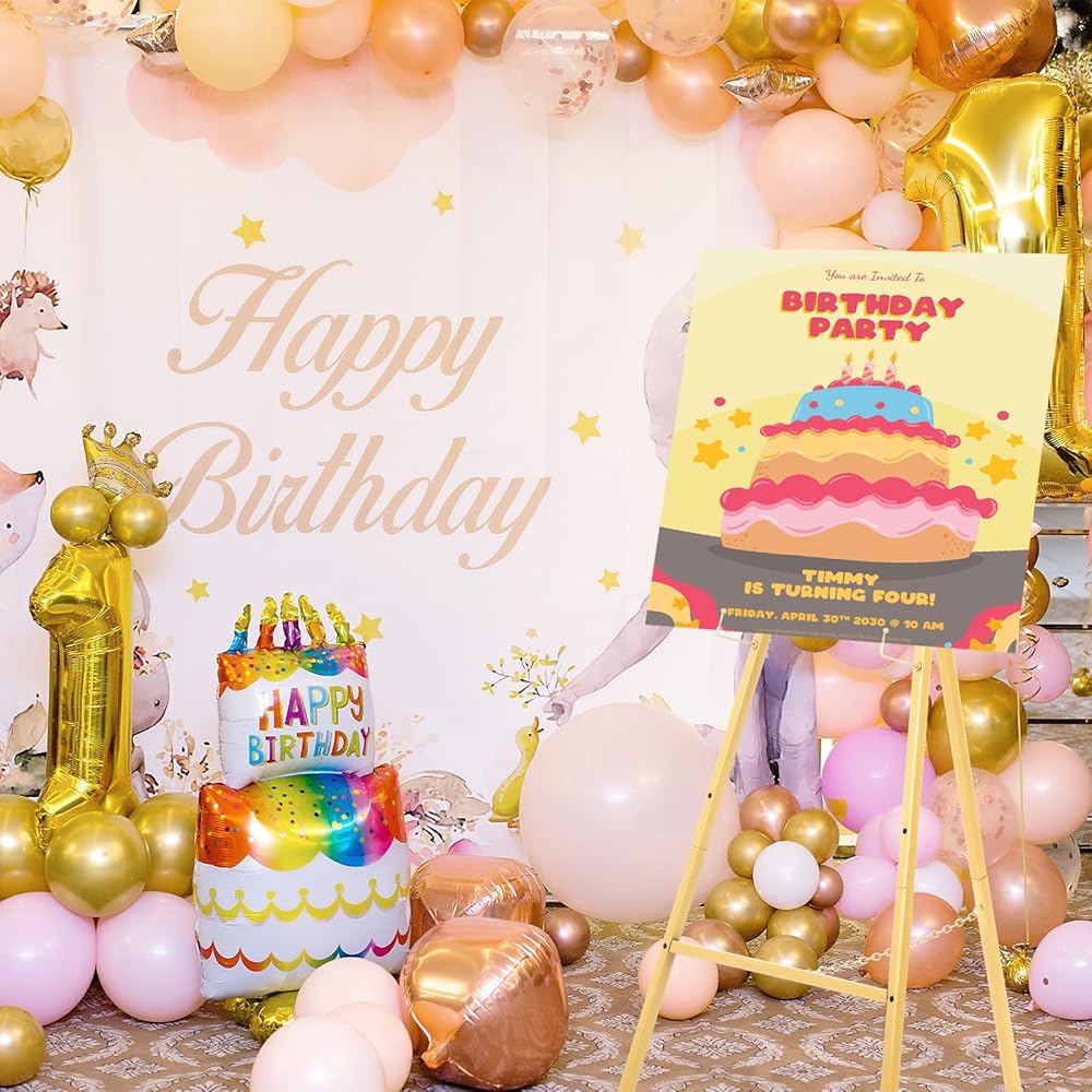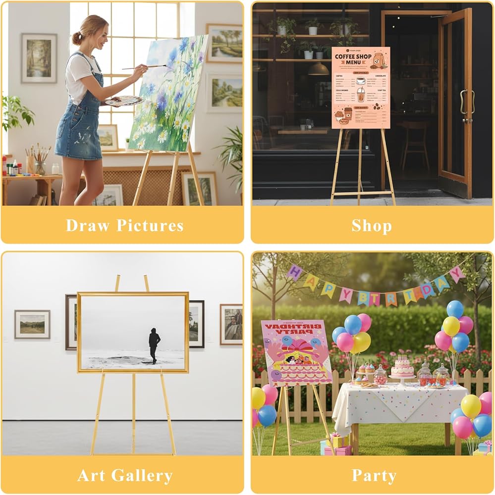 • 【Elegant Displays for Art & Weddings】 This sleek gold easel adds elegance to any setting, whether it's displaying wedding signs, artwork, birthday party, baby showers, heavy-duty mirrors, treasured photographs or event signage, its modern design effortlessly elevates your space with timeless charm.