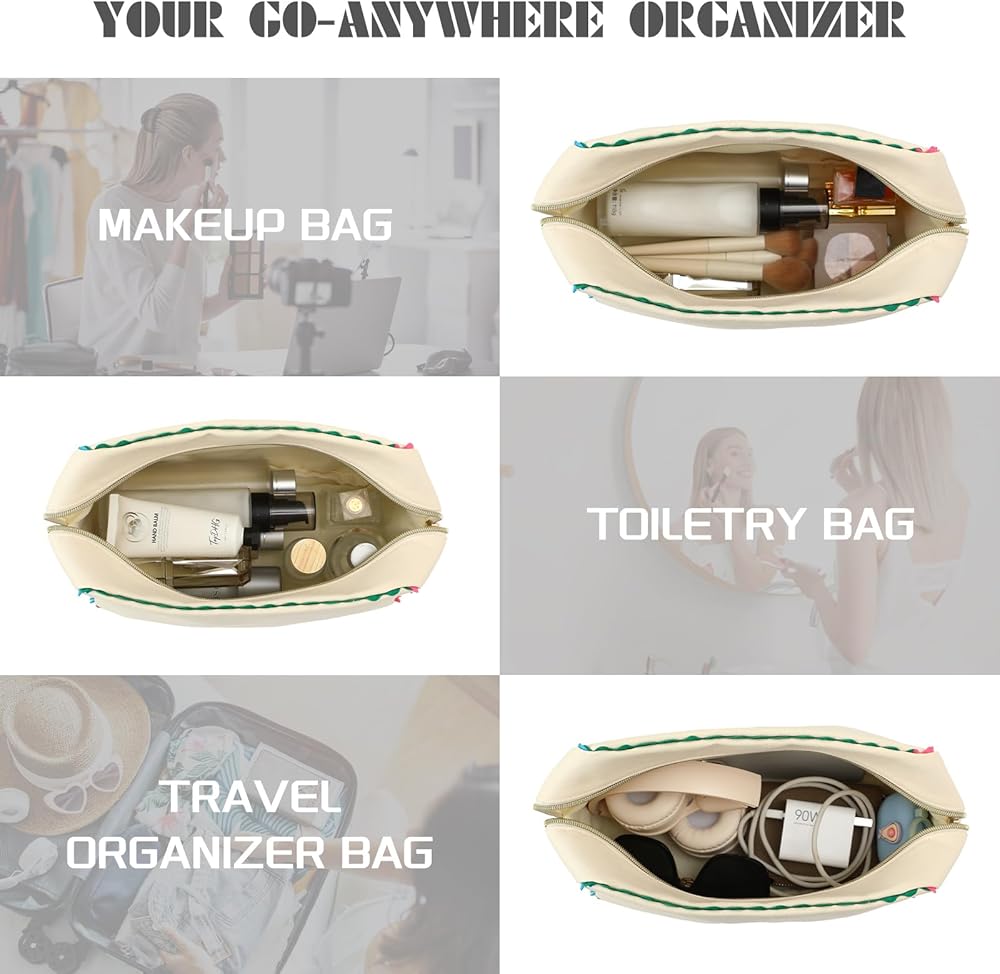 • 【منظم الأغراض الخاص بك في أي مكان】 خفيفة الوزن ولكنها واسعة للغاية، هذه الحقيبة هي شريكك المثالي في كل شيء. يمكنك وضعها في حقيبتك المحمولة لرحلات العمل، أو حزمها لقضاء عطلات نهاية الأسبوع، أو الحفاظ على أغراضك الأساسية مرتبة في المنزل. إنها تحمل المكياج والعناية بالبشرة وأحمر الشفاه ومنتجات الفترة الزمنية والكابلات أو تصبح حقيبة سهلة الاستخدام داخل حقيبة أكبر. أينما تأخذك الحياة، فإنها تحافظ على تنظيم أجزاءك وجعلها أكثر بهجة على الفور.