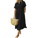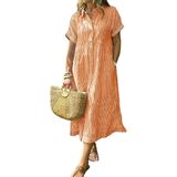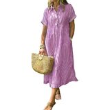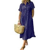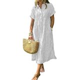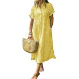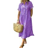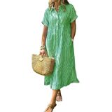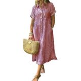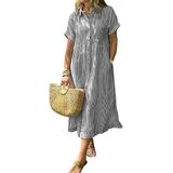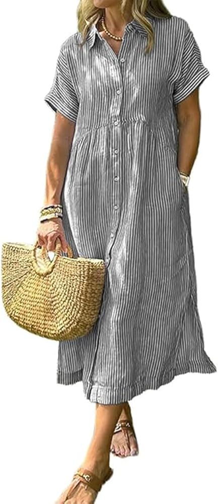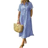 Step into summer with confidence wearing this Women's Summer Striped Button-Down Short Sleeve Lapel Midi Dress. Thoughtfully crafted with attention to detail, this piece combines fashion-forward elements with practical features to meet all your seasonal needs. The striking striped pattern not only enhances the visual appeal but also flatters different body shapes, while the lapel collar adds a touch of elegance. The button-down front ensures effortless dressing, allowing you to customize the fit according to your preference. Additionally, the inclusion of functional side pockets makes this dress more than just stylish—it's incredibly convenient for everyday use. Made from breathable, high-quality material, this dress guarantees comfort throughout the day, whether you're out enjoying the sunshine or relaxing indoors. Its midi length and loose silhouette offer a relaxed yet put-together appearance, perfect for casual outings, weekend getaways, or informal social events. Easily accessorize it with sandals, sunglasses, or a light cardigan to adapt to changing temperatures and styles. This versatile dress is a must-have addition to your summer collection, blending comfort, functionality, and timeless charm into one cohesive package. Embrace the joys of effortless dressing with this stunning option tailored for warm-weather adventures.