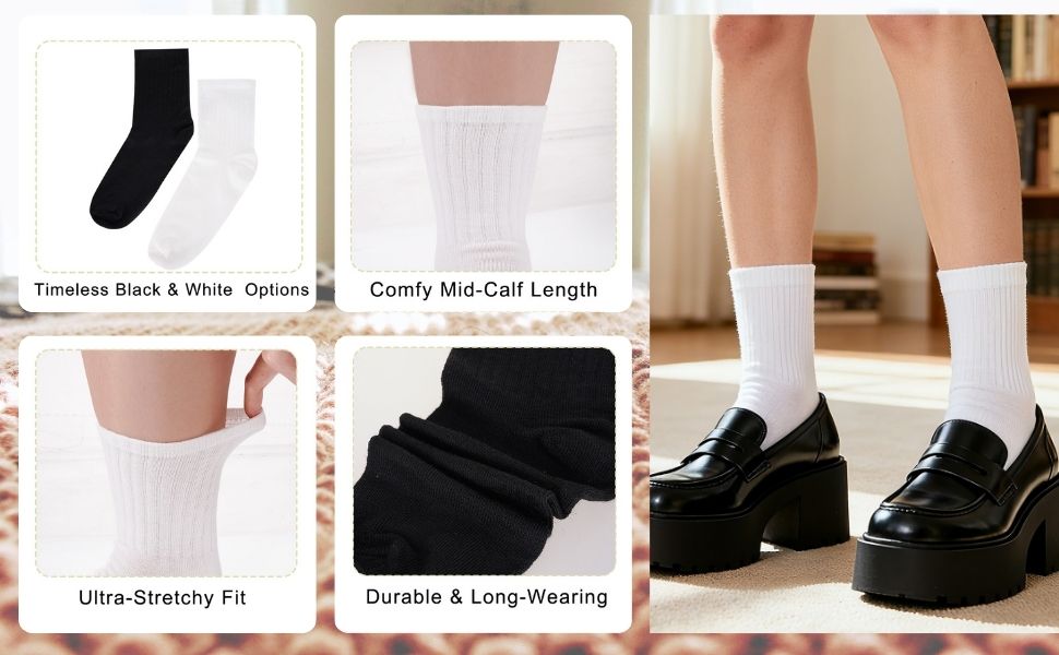 ملاءمة مريحة وآمنة: مصمم بشريط علوي مرن معزز يبقى في مكانه دون الانزلاق أو التكتل ويعانق الساق بلطف ويعزز مناطق أصابع القدم/الكعب لمزيد من المتانة. يناسب القماش القابل للتمدد معظم مقاسات الأحذية النسائية، مما يمنع التكتل أو الترهل أثناء المشي أو الجري أو التدريبات.