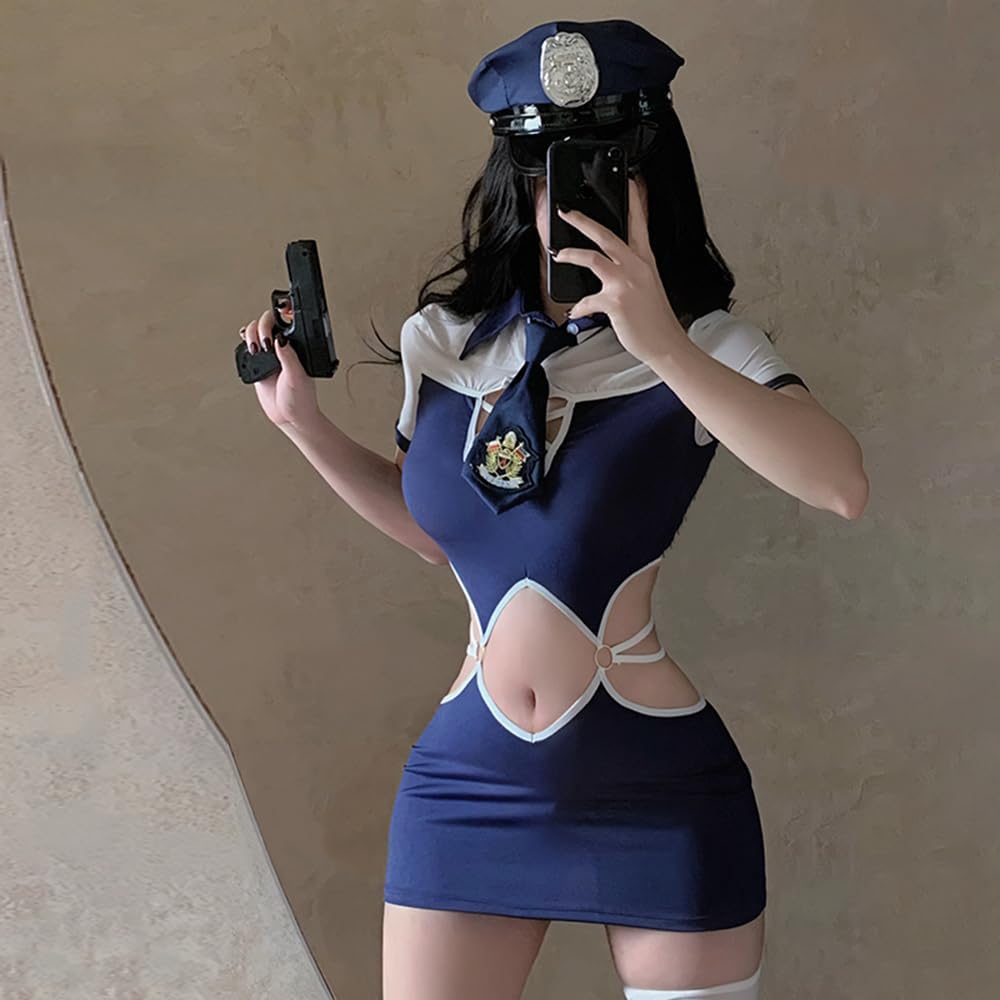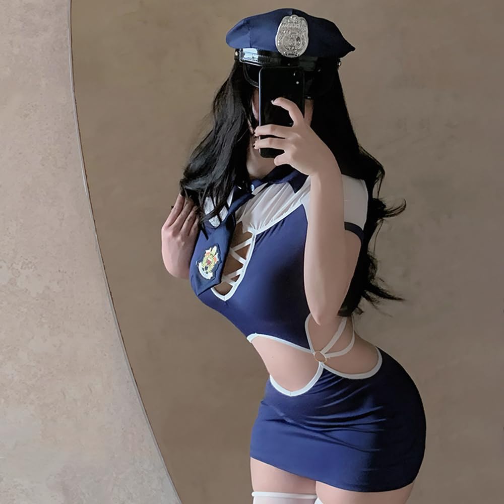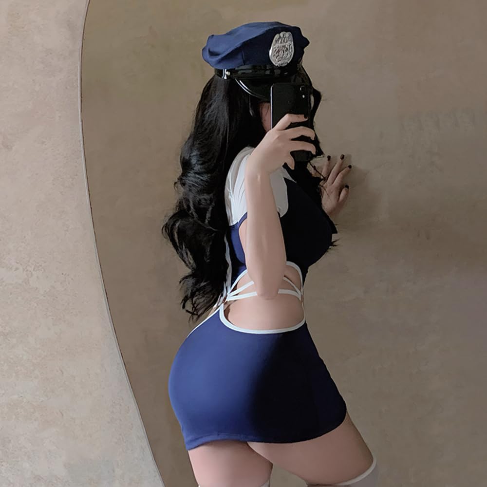 This set includes everything for a complete look, no extra pairing required. The classic navy blue and white combo gives off a police uniform vibe, while the badge-adorned hat and tie complete the stunning policewoman look.