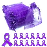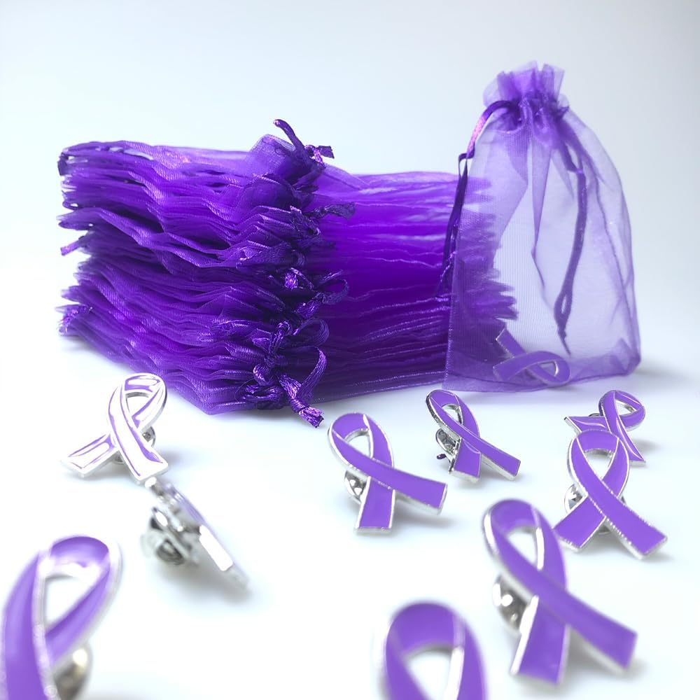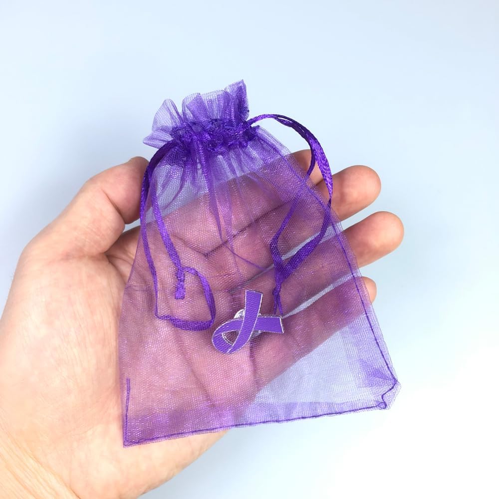 50 قطعة من دبوس شريط التوعية الأرجواني مع أكياس هدايا الأورجانزا