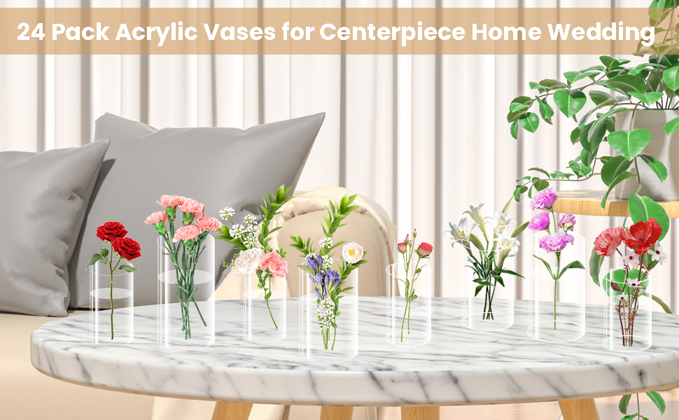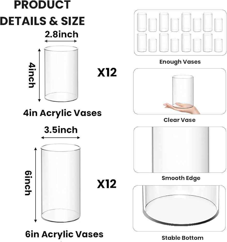 【24 عبوة من مزهريات الأكريليك】: سوف تحصل على 24 عبوة من مزهريات الأكريليك، بما في ذلك 12 عبوة من مزهريات الأكريليك الصغيرة مقاس 4 بوصات و12 عبوة من مزهريات الأكريليك مقاس 6 بوصات. سواء في المنزل أو المكتب أو في الهواء الطلق، فإن الكمية كافية لتلبية احتياجات الزخرفة الزهرية.