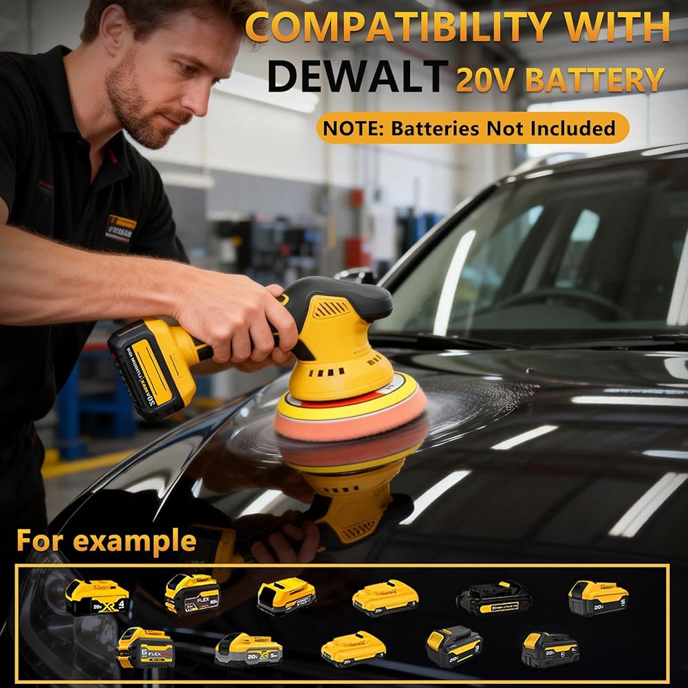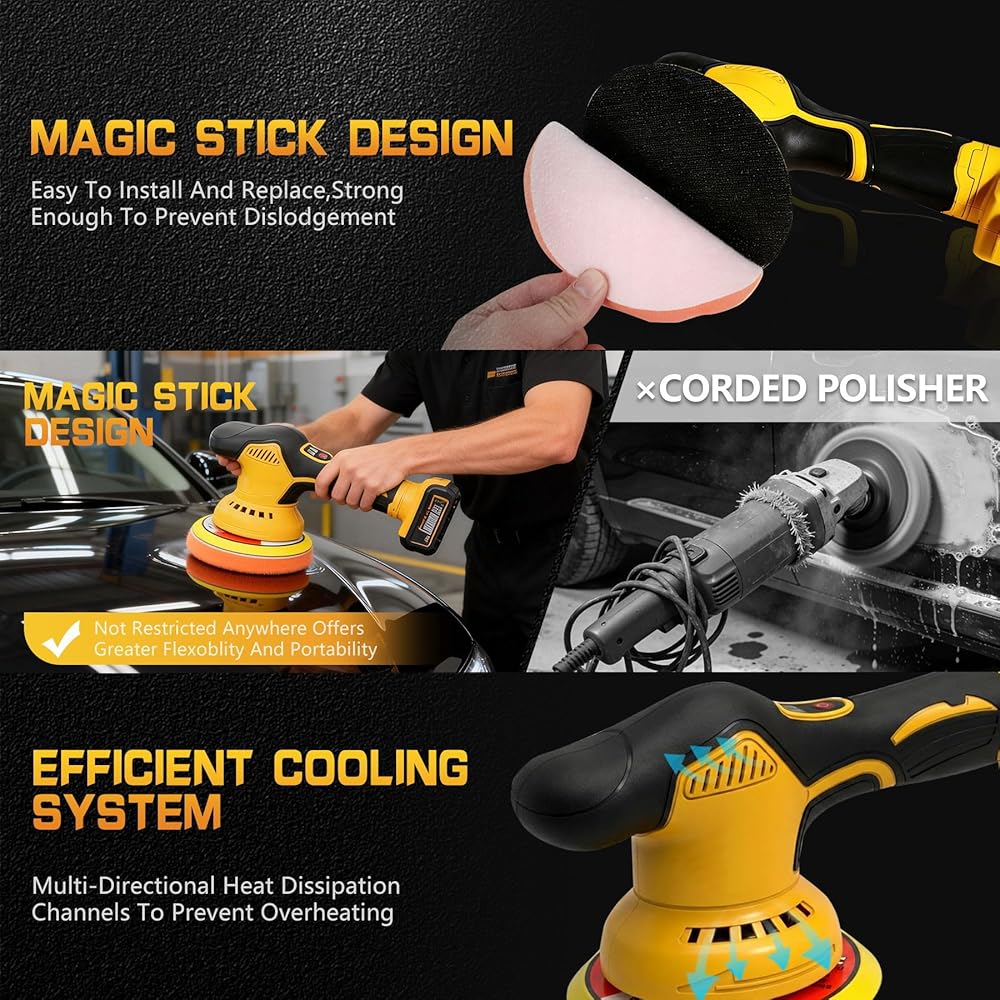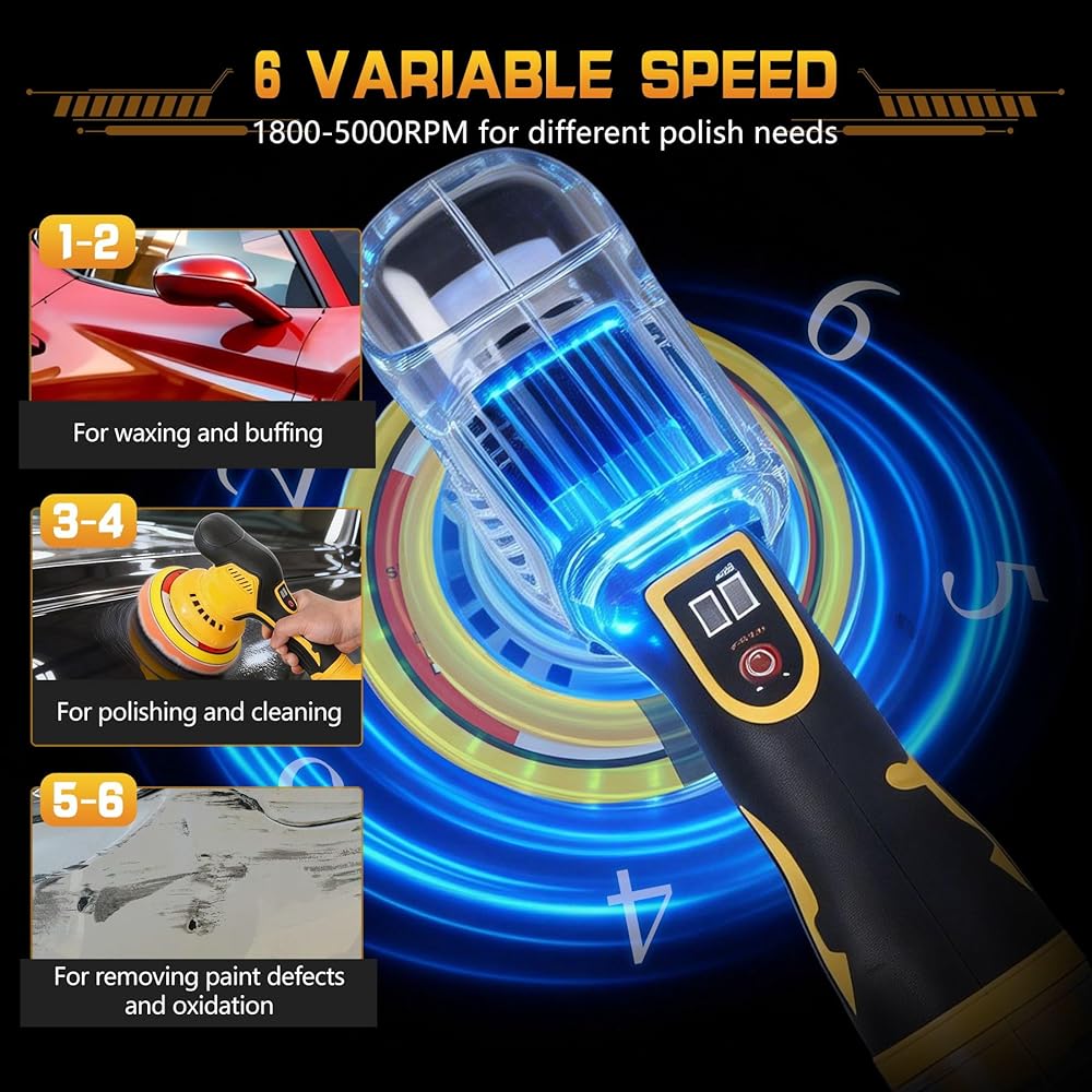 • ADVANCED BRUSHLESS TECHNOLOGY: Equipped with an upgraded high-efficiency brushless motor, this cordless car buffer delivers consistent torque comparable to corded units. Enjoy longer motor life, higher efficiency, and a quieter operation during intense detailing.