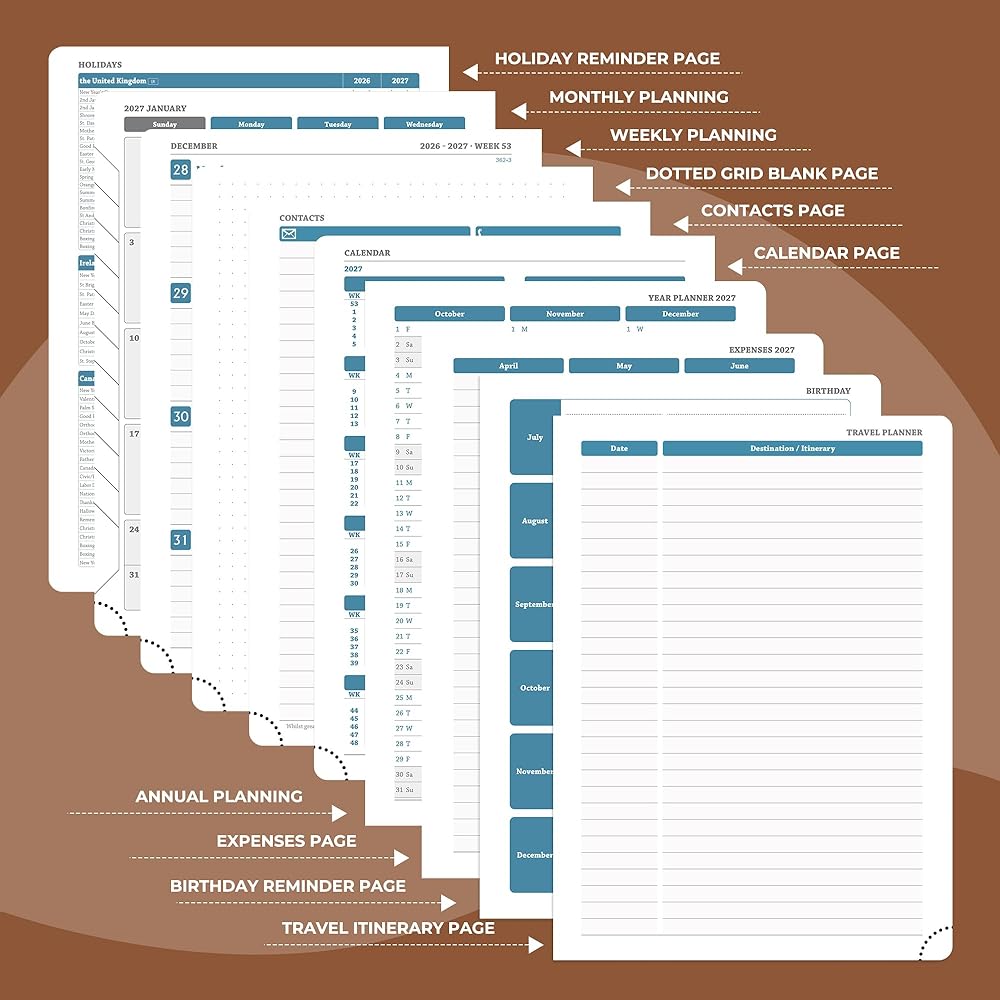 Universal Design Planner: Suitable for a variety of people and scenarios. Professionals manage project progress, meeting arrangements and goals; student planner 2026-2027 courses, exams and extracurricular activities; home users arrange travel, activitie