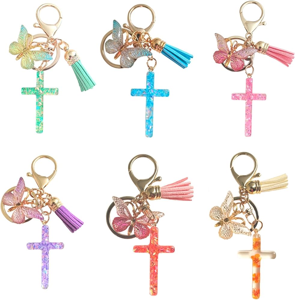 12 قطعة الإيمان المسيحي الصليب المفاتيح للنساء شرابة عقد بحلية متدلية على شكل فراشة حلقات المفاتيح لمحفظة حقائب النساء الهدايا