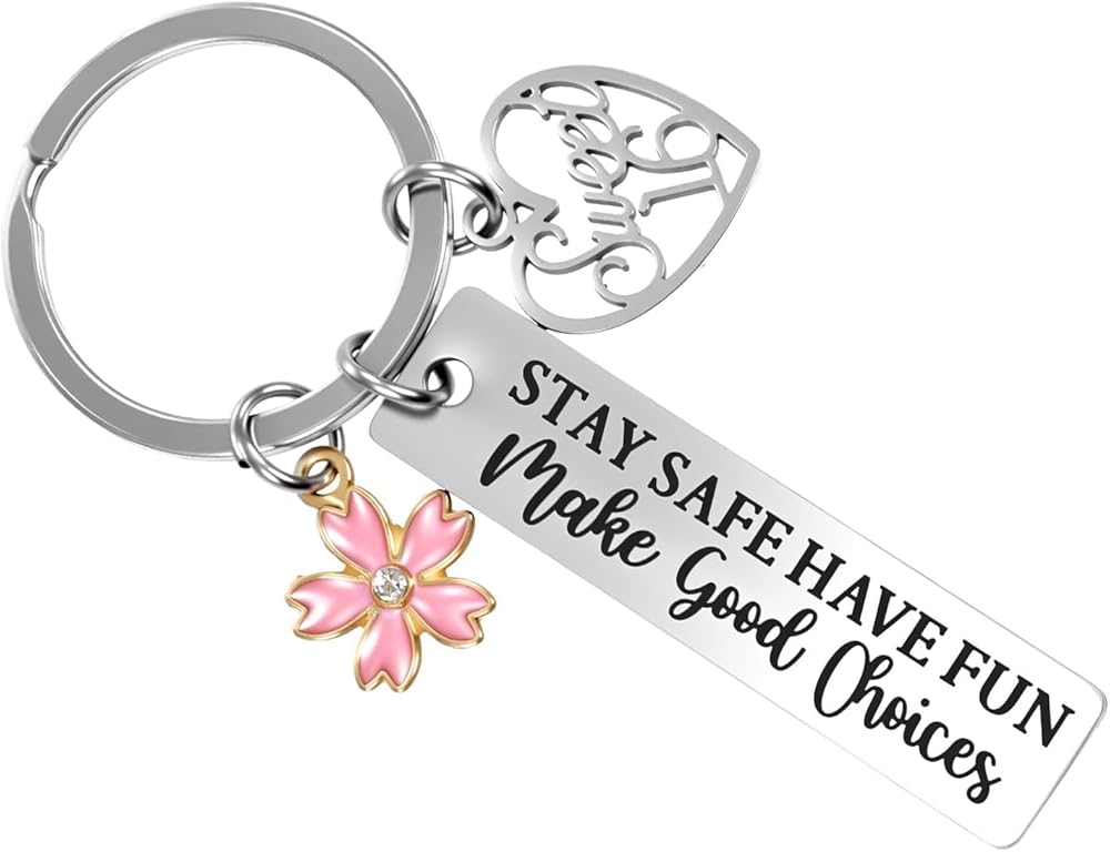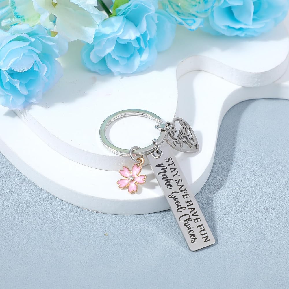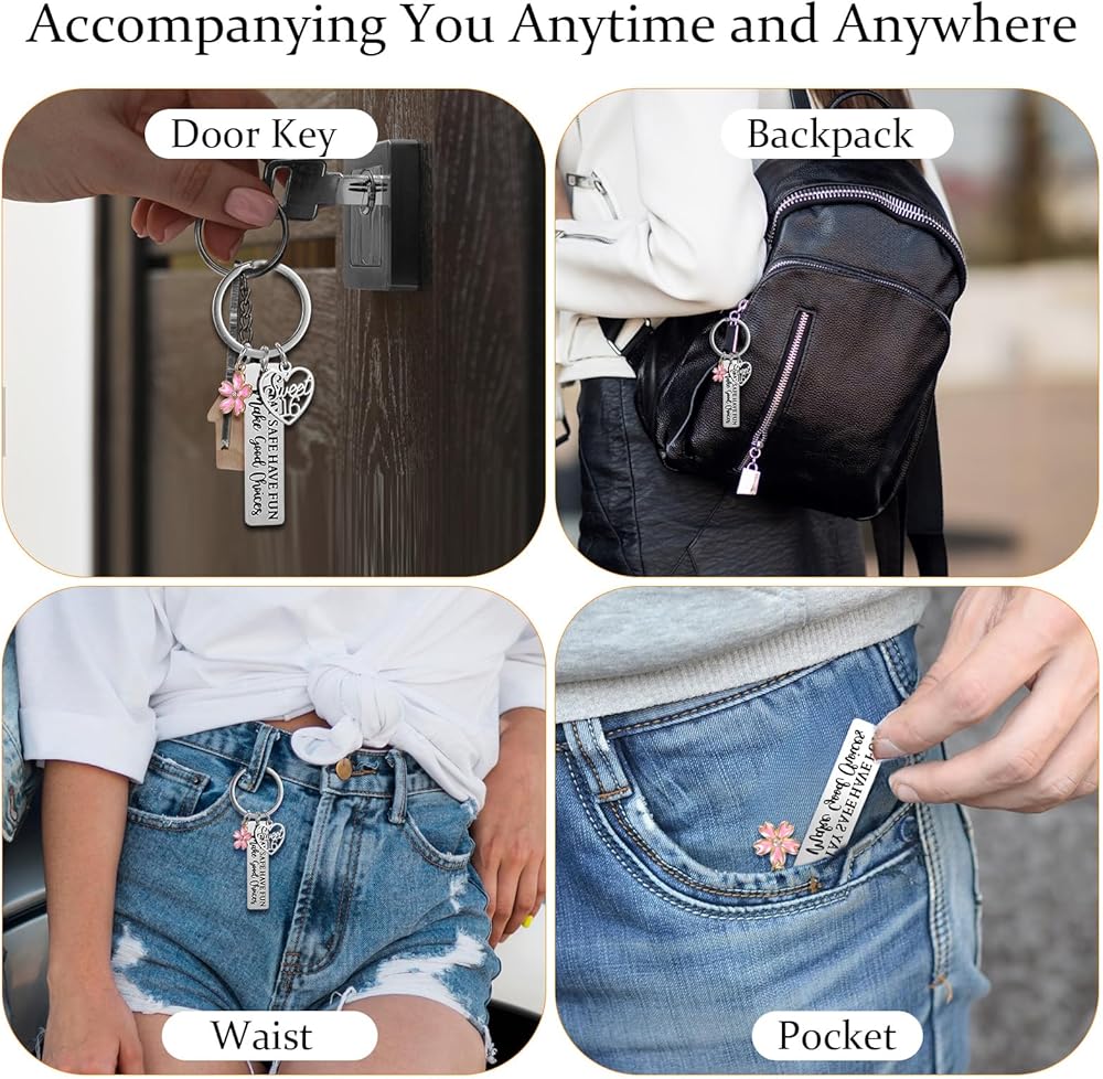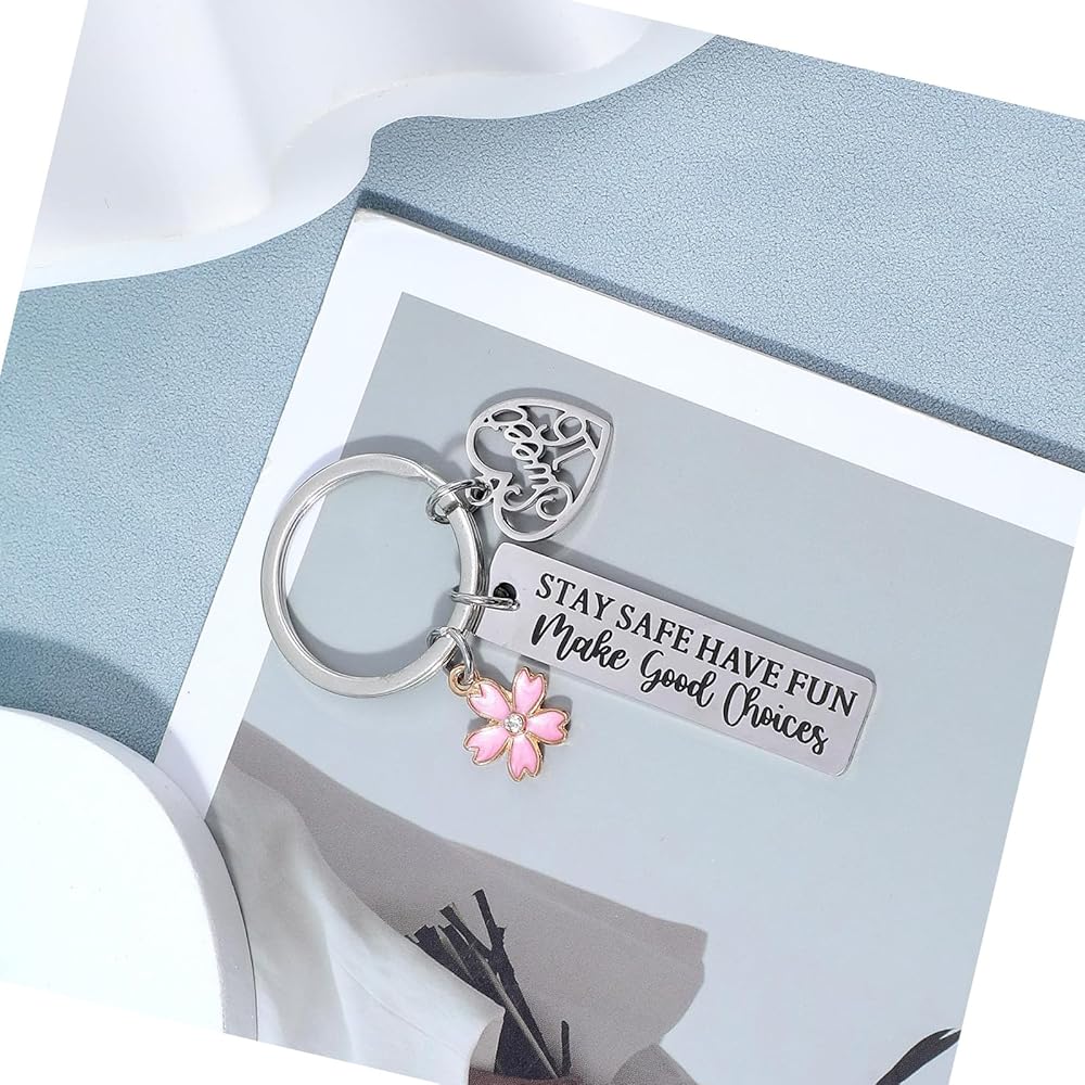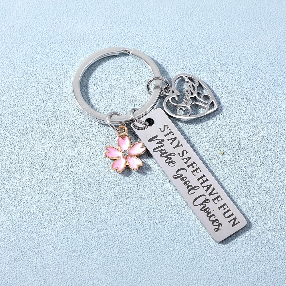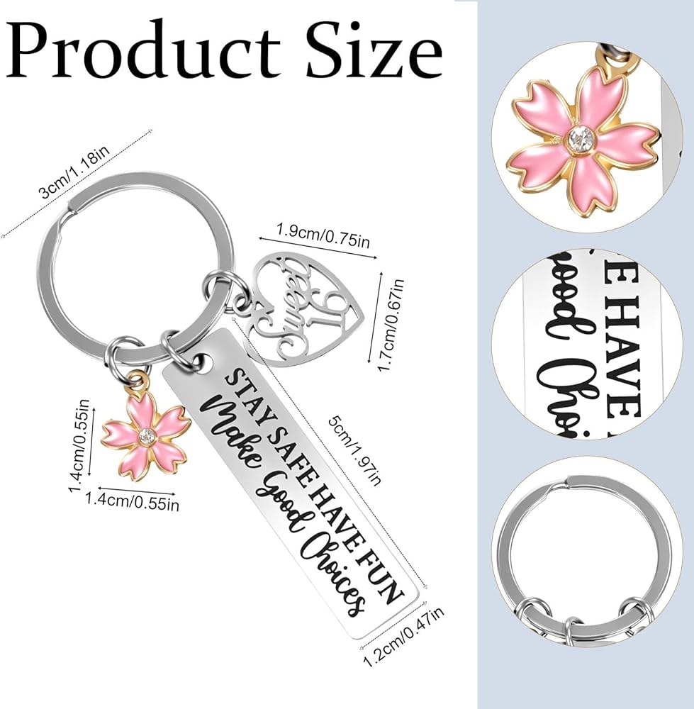 【Sweet 16 Keychain Design】The 16 birthday gifts keychain is engraved with the words: "stay safe, have fun, make good choices" the flower pendant symbolizes that 16 years old is as beautiful as a flower. A special 16th birthday gift that she will always treasure