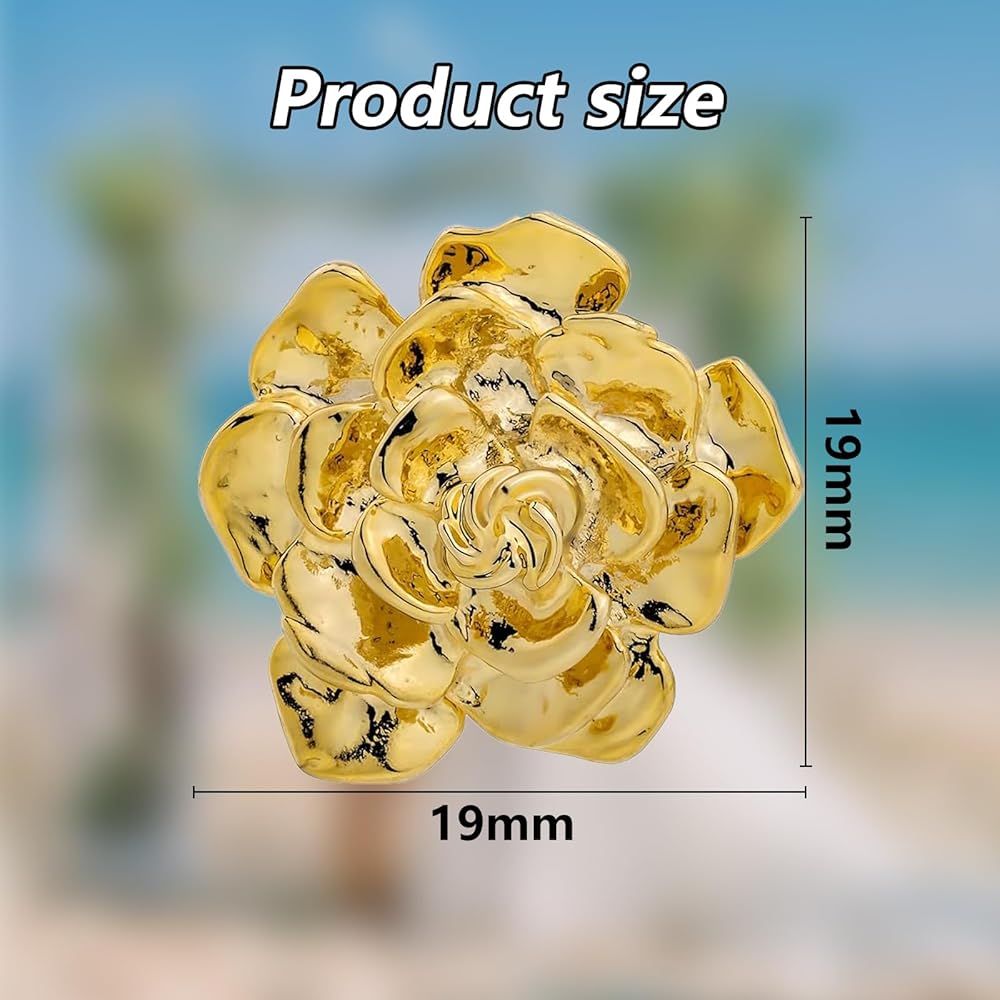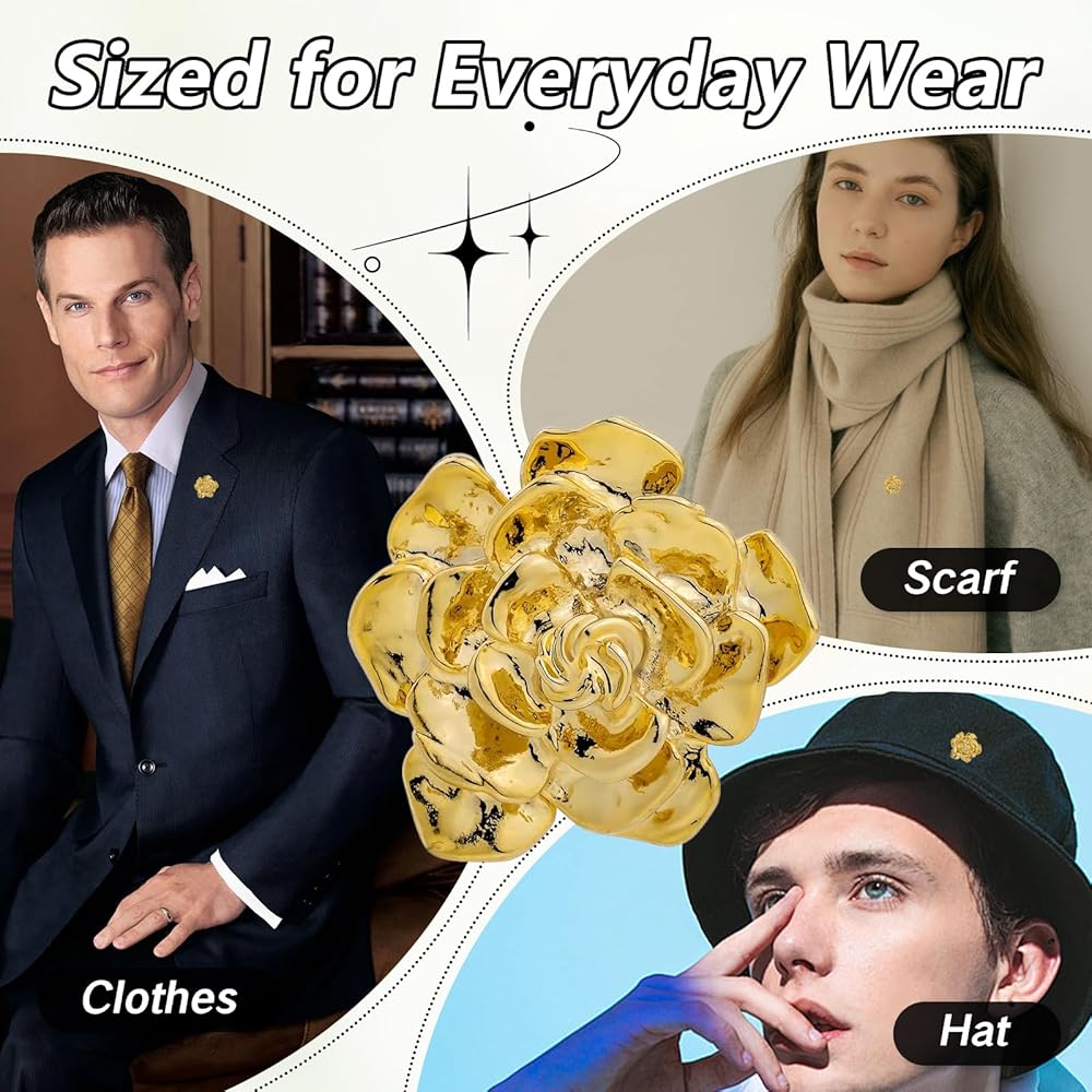 This striking flower-shaped pin brings artisanal flair to your wardrobe, serving as a suit gold pin or accent on a casual sweater. Its rich contours and three-dimensional petals capture light from every angle, drawing subtle attention without overpowering your ensemble. Whether paired with a tailored blazer or layered over a knit, this metal accessory introduces a refined focal point that elevates your personal style.