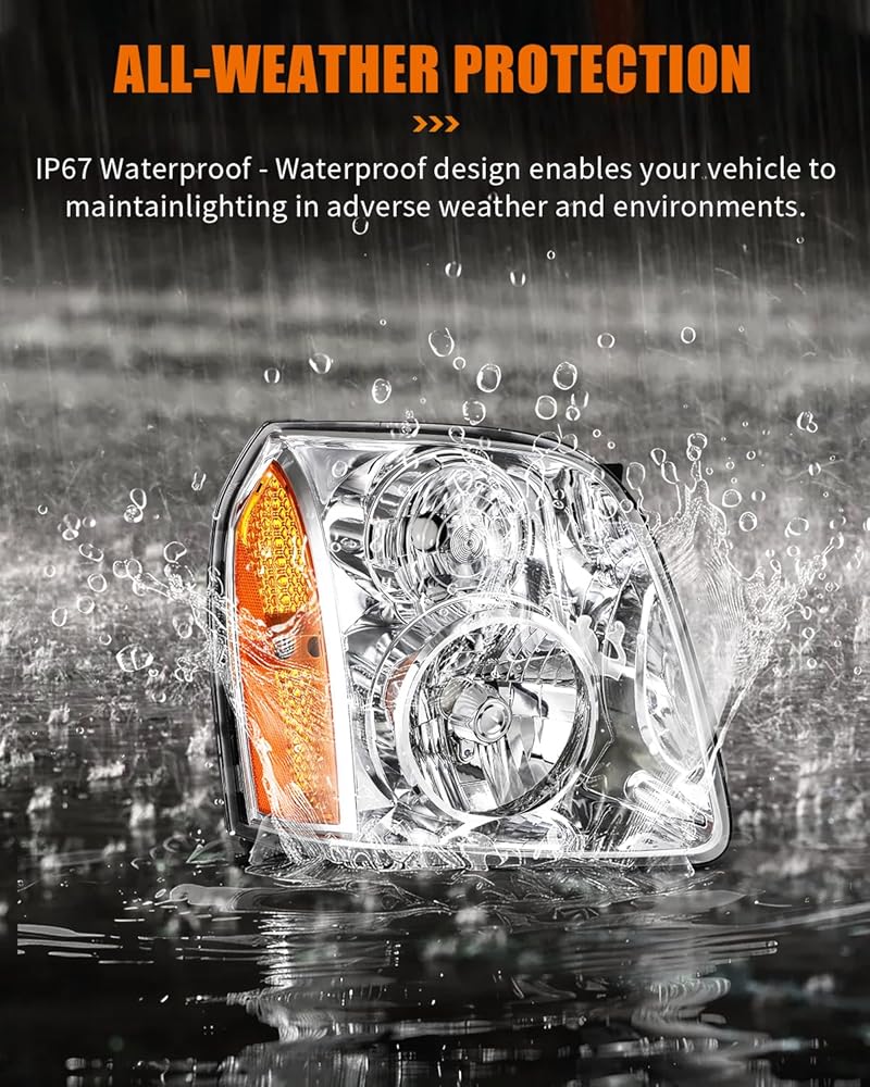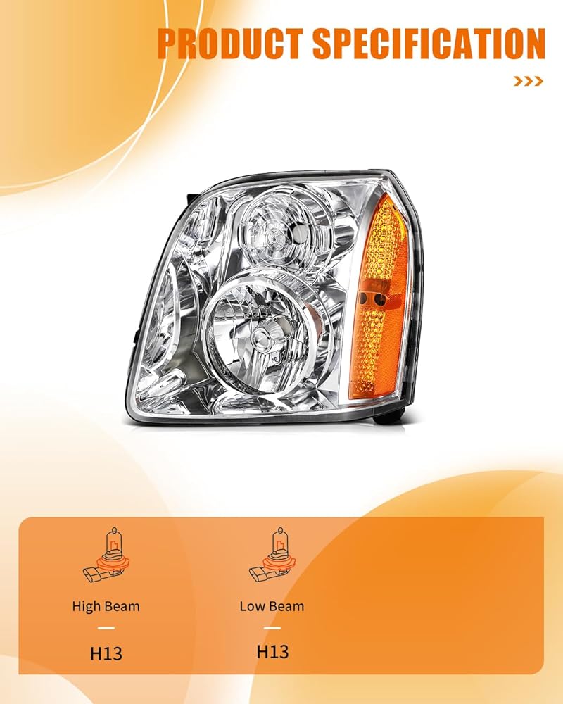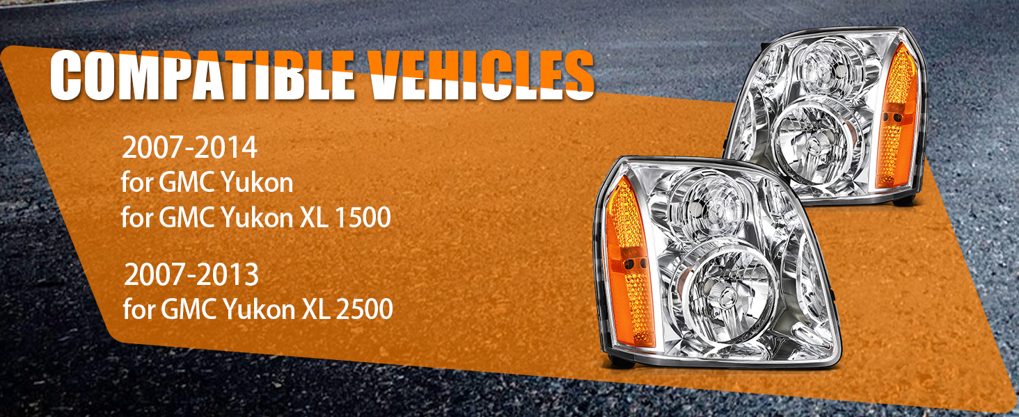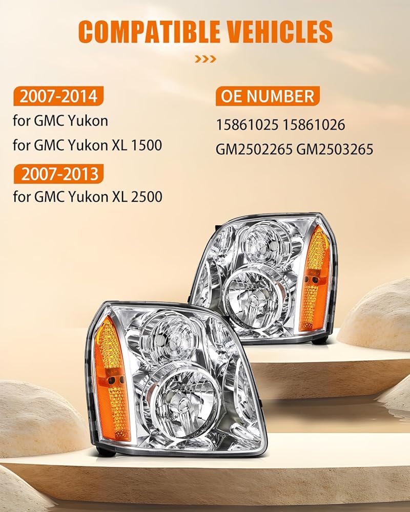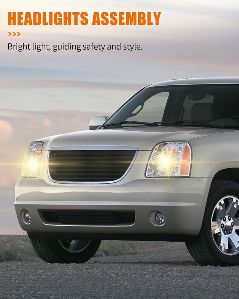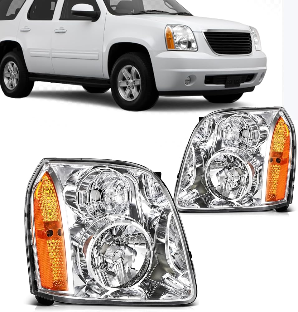 قطعتان من مجموعة المصابيح الأمامية لسيارة جي إم سي يوكون 2007-2014 لسيارة جي إم سي يوكون XL 1500 2007-2014 لسيارة جي إم سي يوكون XL 2500 2007-2013 غطاء كروم كهرماني عاكس عدسة شفافة استبدال 15861025 - المصابيح غير متضمنة