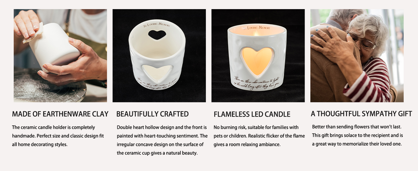 مصنوعة يدويًا بشكل جميل. كل قطعة مصنوعة يدوياً بعناية من الطين الفخاري، مما يمنحها شعوراً فريداً. بفضل تصميمه الجميل ذو القلب المزدوج، يتوهج الضوء الدافئ بهدوء من خلال فتحات القلب، مما يخلق جوًا لطيفًا. إلى جانب الملمس السطحي الطبيعي غير المستوي قليلاً، يضفي هذا الوميض الدافئ إحساسًا دافئًا ومريحًا على أي غرفة، وهو مثالي كتذكار تعاطف لأولئك الذين يحتاجون إلى الراحة.