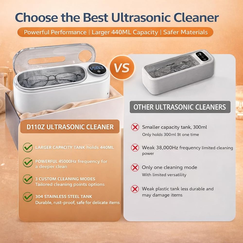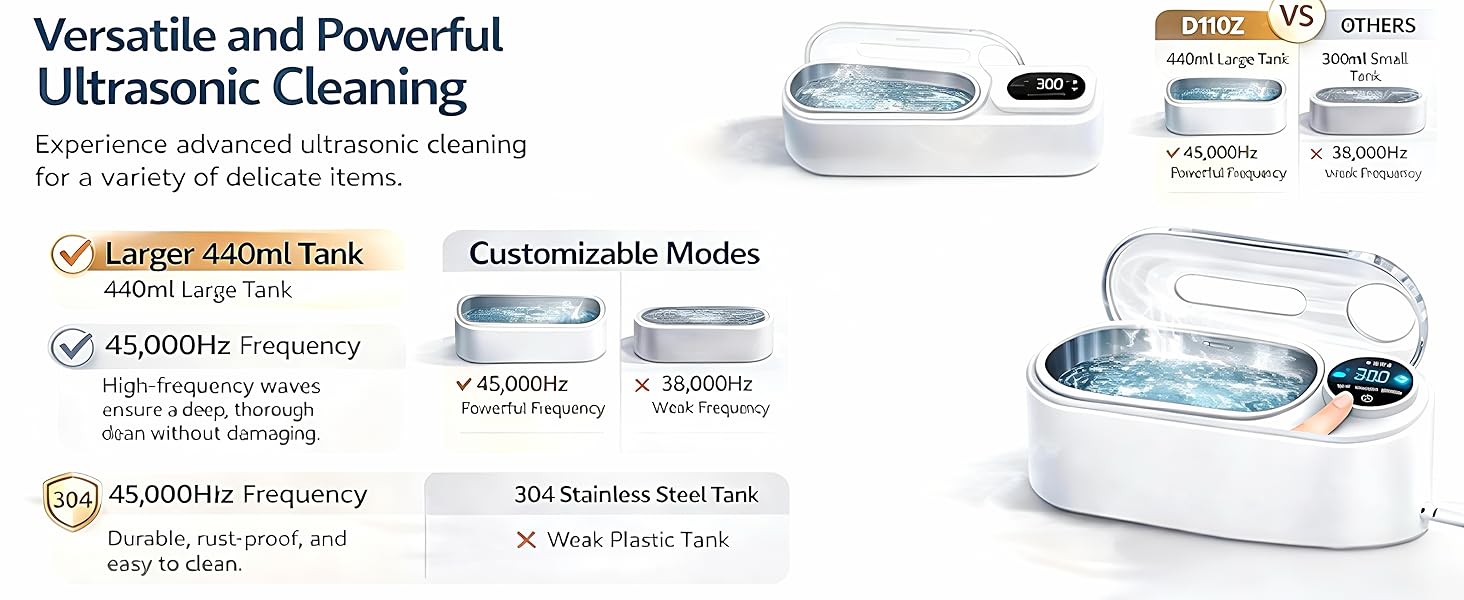 سعة كبيرة مطورة 440 مل - تنظيف أكثر، توفير الوقت أكبر من المنظفات بالموجات فوق الصوتية التقليدية 300 مل، خزان 440 مل الذي تمت ترقيته يناسب عناصر أكبر وقطع متعددة في وقت واحد. قم بتنظيف المزيد في دورة واحدة وتقليل مرات التشغيل المتكررة لاستخدام يومي أسرع