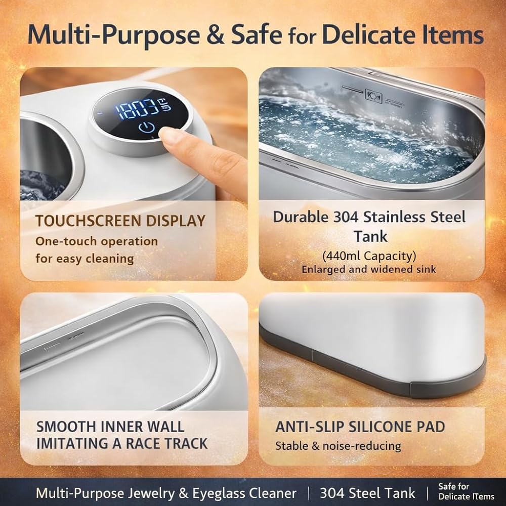 آمن للمجوهرات والنظارات والساعات والمزيد مثالي للخواتم والقلائد والنظارات وأشرطة الساعات وأطقم الأسنان والعملات المعدنية وغيرها من الضروريات اليومية. يضمن الخزان المتين المصنوع من الفولاذ المقاوم للصدأ 304 تنظيفًا آمنًا وفعالاً لمعظم المواد غير المسامية