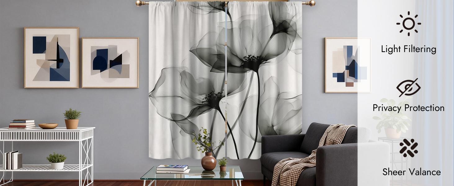 - **خامة عالية الجودة**: مصنوعة من ألياف البوليستر الناعمة والناعمة، هذه الستائر الزهرية منسوجة بكثافة لعزل أفضل ضد أشعة الشمس، مما يضمن المتانة وطول العمر.