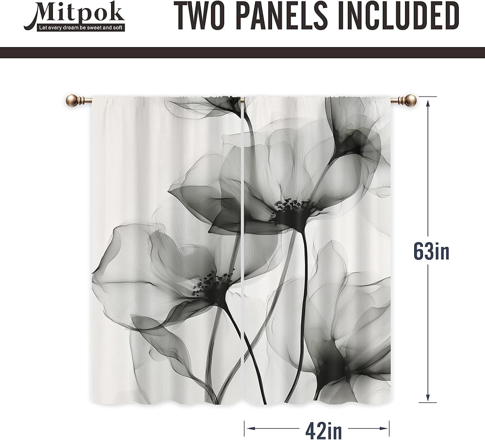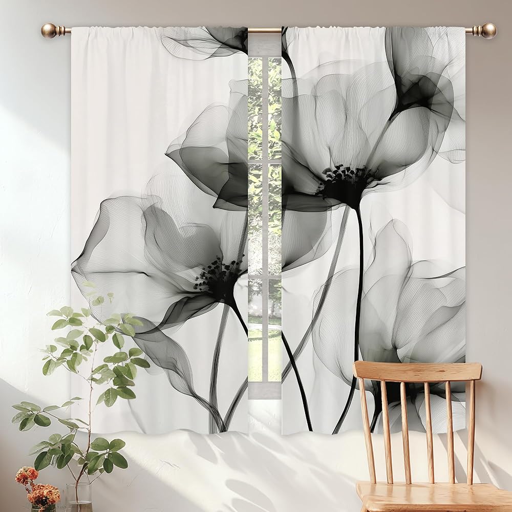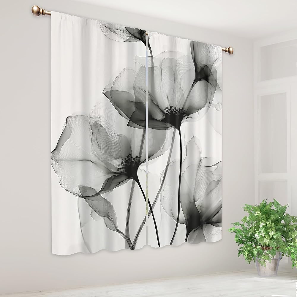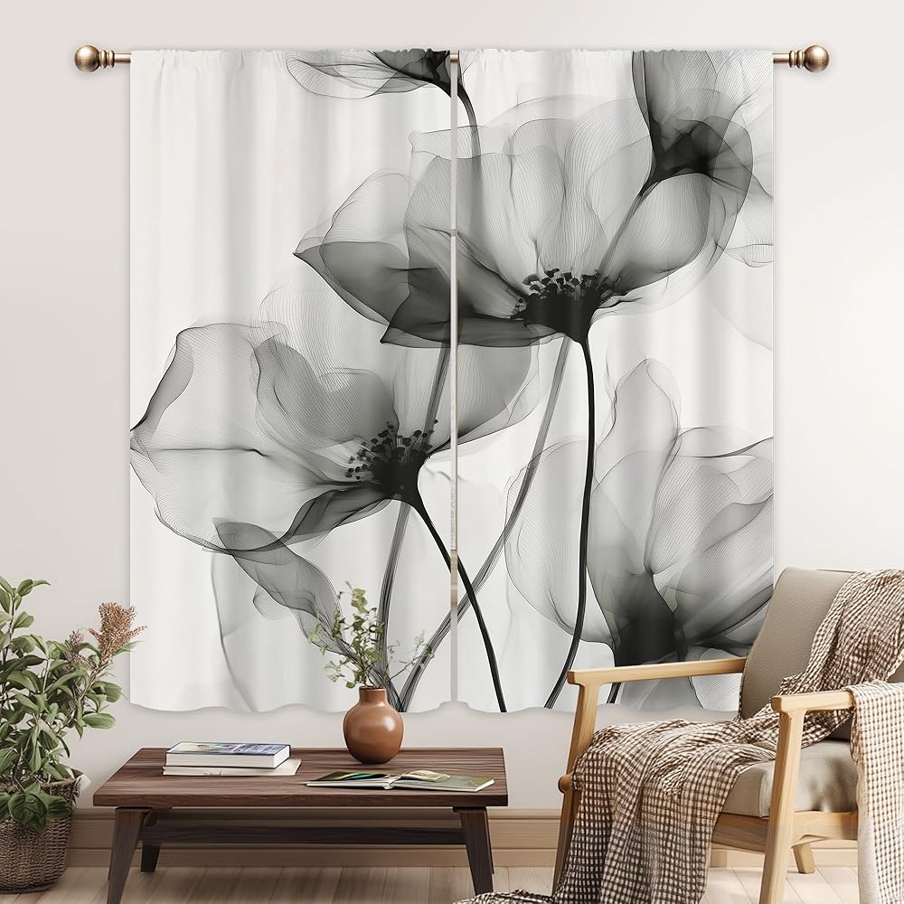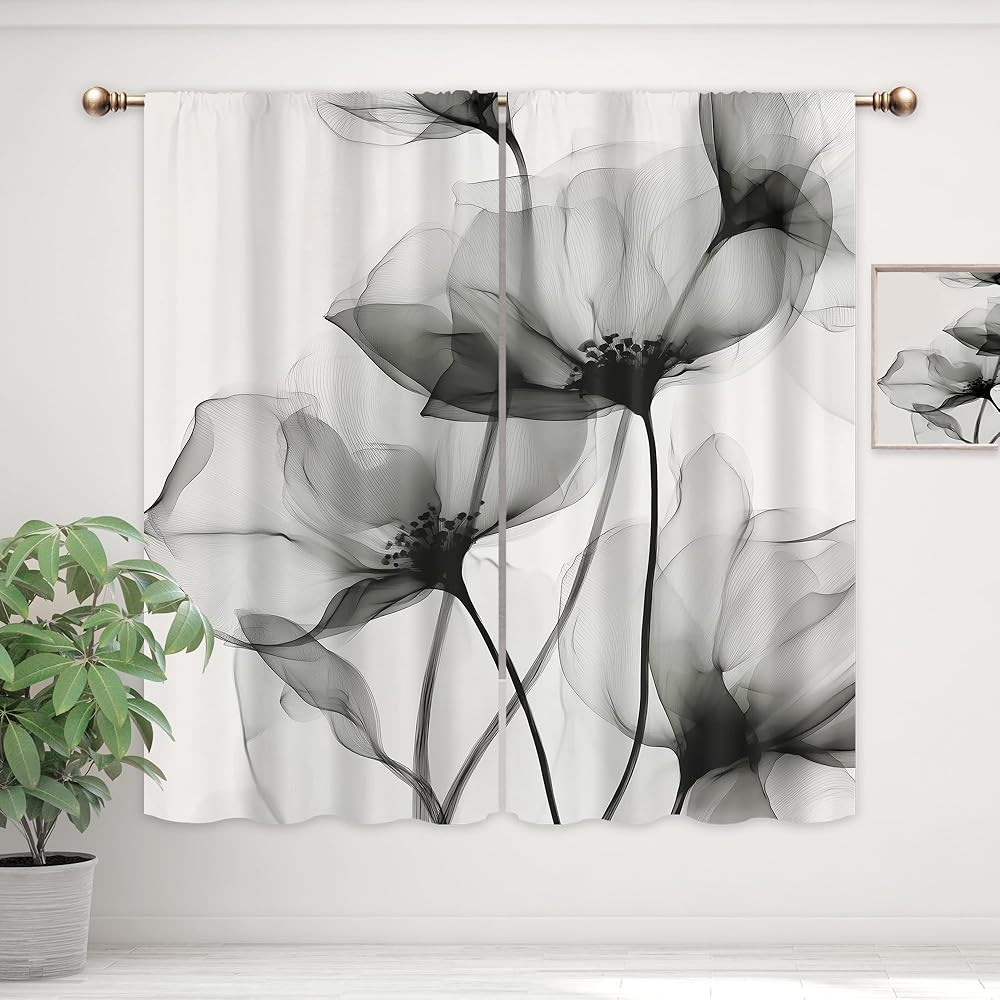 ستائر زهرية رمادية لغرفة النوم 42 عرض × 63 ارتفاع بوصة قضيب جيب أبيض وأسود حبر زهرة ألوان مائية ربيع بساطتها الحديثة البسيطة الجمالية 2 لوحة معالجة النافذة لديكور غرفة المعيشة