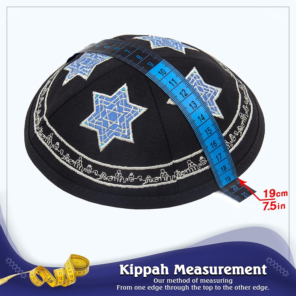 • 🔯 Precision Fit: With dimensions of 19CM/7.5" when laid flat and 15CM/5.9" edge-to-edge, these kippot offer an ideal fit for adults and children, ensuring comfort and style for all wearers.