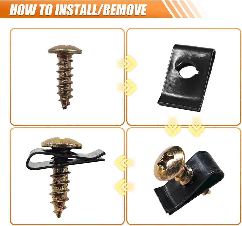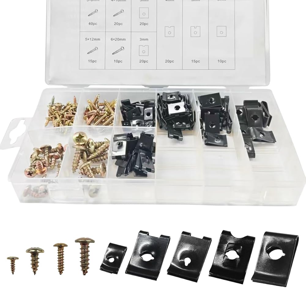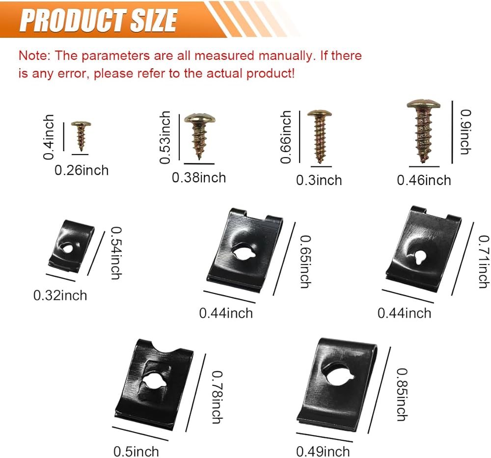 【Package Include and Size】: The car U-nut screw set includes 9 common specifications, namely 20 3mm U-shaped clamps, 20 3mm grooved U-shaped clamps, 20 4mm U-shaped clamps, 15 5mm U-shaped clamps, and 10 6mm U-shaped clamps. 40 M3x8mm screws, 20 M4x16mm screws, 15 M5x12mm screws and 10 M6x20mm screws. Note: Please be sure to confirm the model and size of the product in advance to ensure they are compatible with your vehicle.
