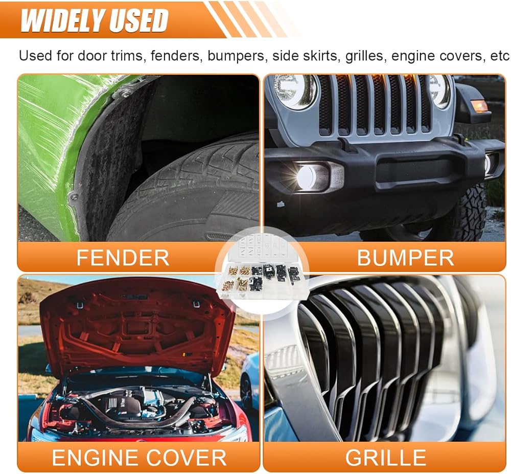 【Application】: The car door panel clips kit can perfectly match the vehicle's instrument panel door plate clamping project and can be widely used in door trim panels, radiators, fenders, bumpers, side skirts, grilles, guards, engine hoods, and other components, meeting diverse fastening requirements.