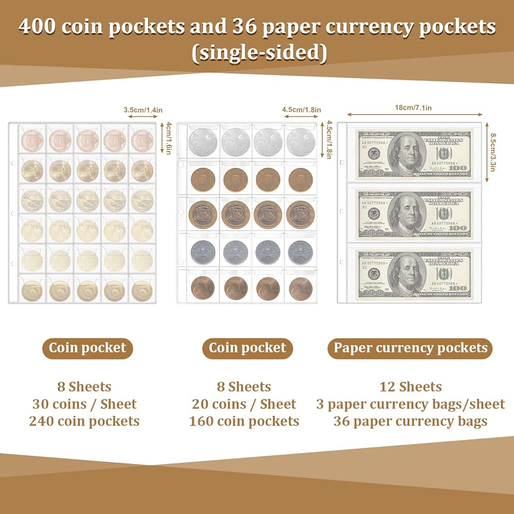 • Package Contents: You will receive one coin collection book holder for collectors, containing 400 pockets coin collection album & 36 paper currency organizer binder. The various sizes of coin collection album offer ample capacity to meet your collecting needs