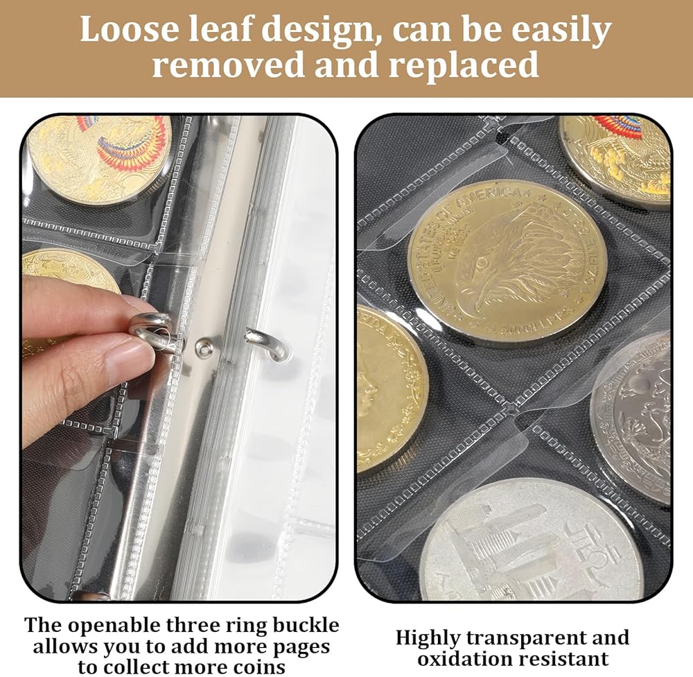 • Binder Design: Our coin book features a binder design for quick and easy removal, allowing you to easily view your collection at any time. You can easily add or remove pages as needed. The stainless steel binder of the coin binder is sturdy, durable, and well-made