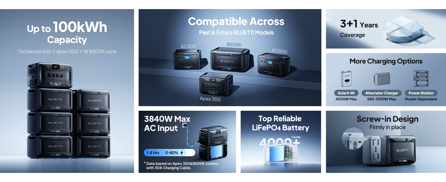 [متوافق على نطاق واسع] - يعمل B500K مع محطات الطاقة المحمولة BLUETTI السابقة والمستقبلية بما في ذلك AC200L AC200MAX AC300 AC500 وApex 300. تتضمن هذه القائمة كابل P090A متوافق مع معظم محطات الطاقة. يتطلب AC500 كابل P150D منفصلاً.