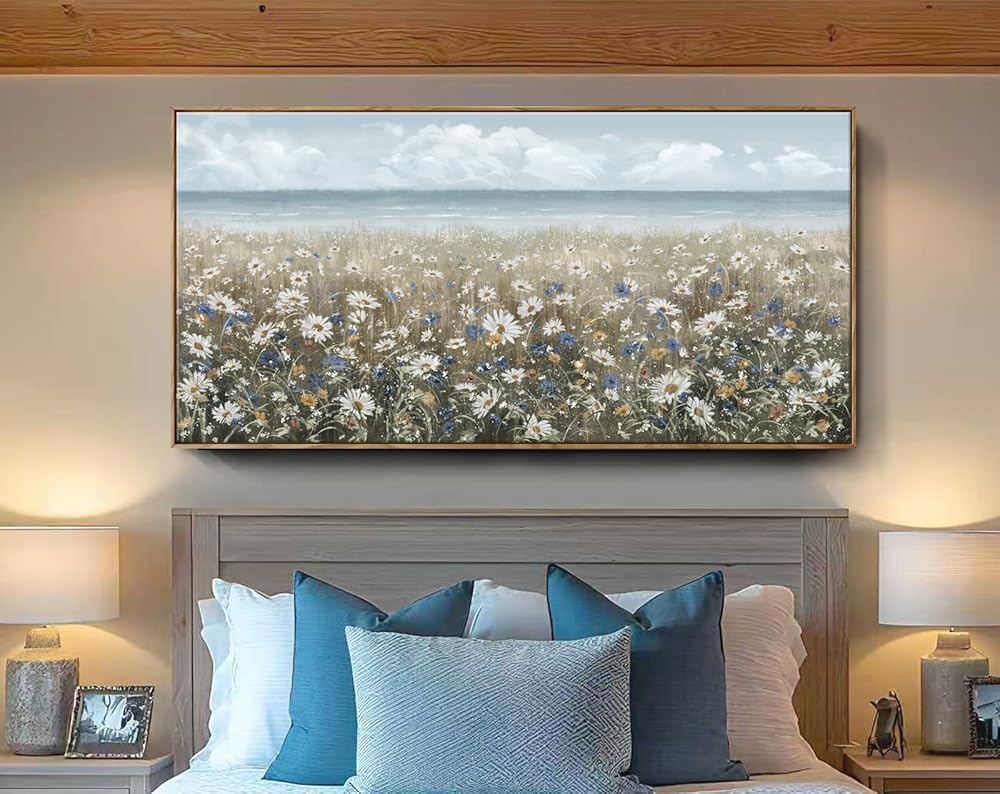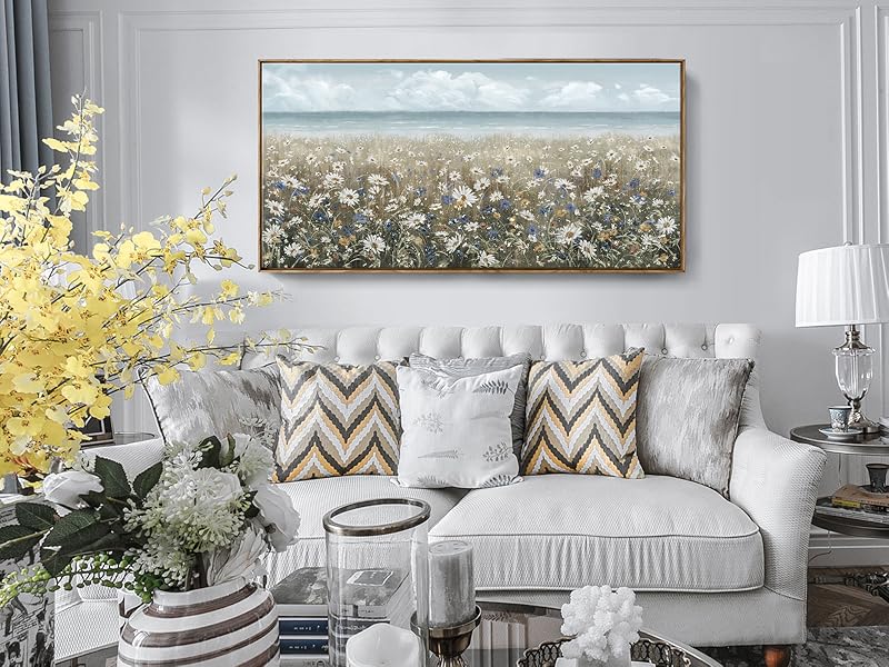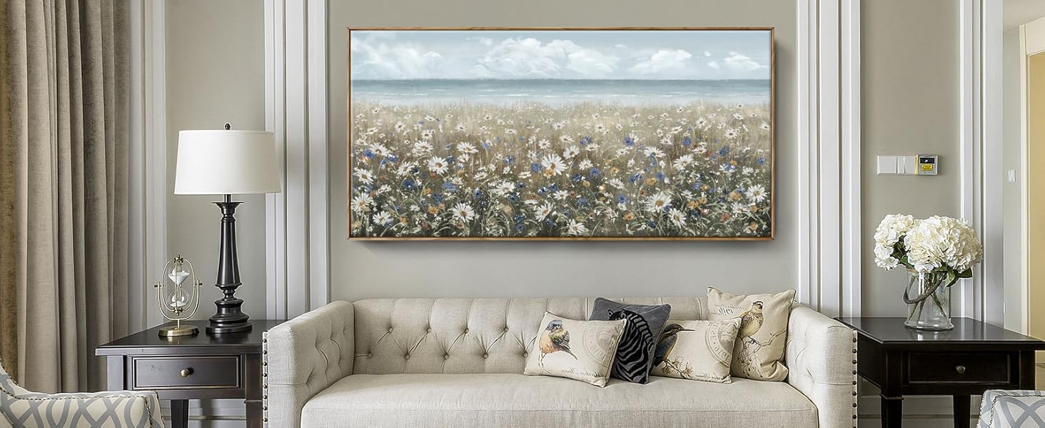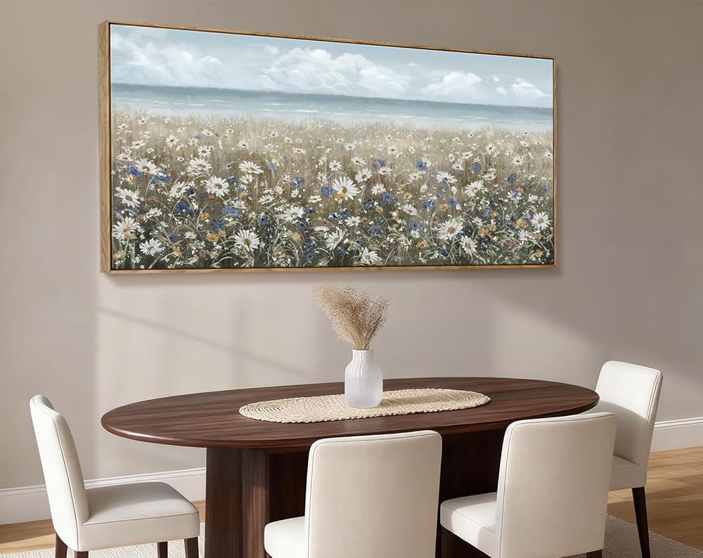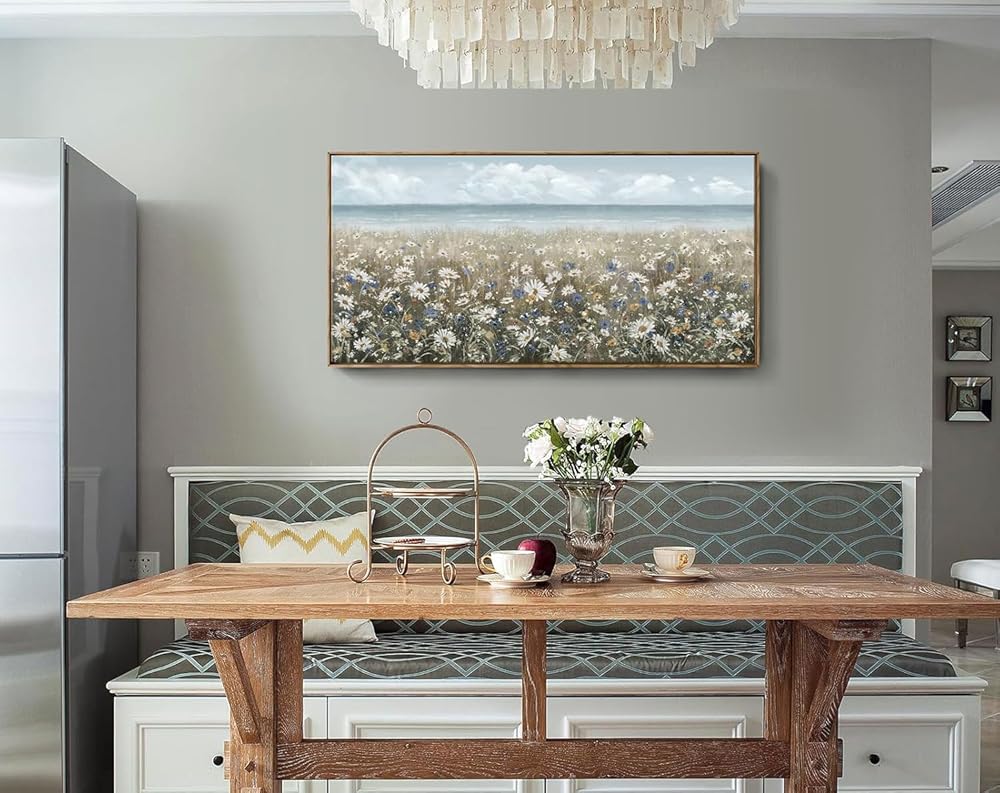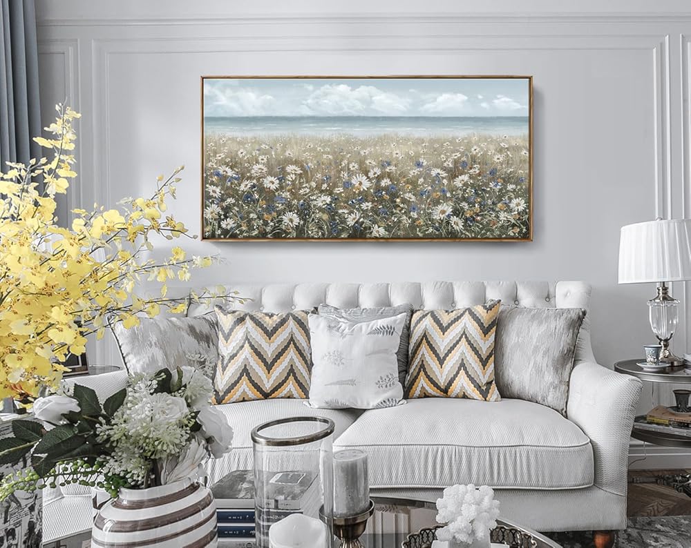 ➤ أضف أجواء الشاطئ إلى مساحتك الخاصة: يصور هذا الفن الجداري الزهري شاطئًا مغطى بالزهور البرية المزهرة حديثًا. يتميز النصف العلوي من اللوحة الفنية الجدارية المصنوعة من القماش الزهري بسماء زرقاء ومحيط هادئ بدرجات اللون الأزرق والرمادي الفاتح للحصول على مظهر منعش ومنسم. النصف السفلي من العمل الفني مغطى بلوحة محايدة من الأبيض والكريمي والبني لإكمال قطعة المزرعة الساحلية هذه.