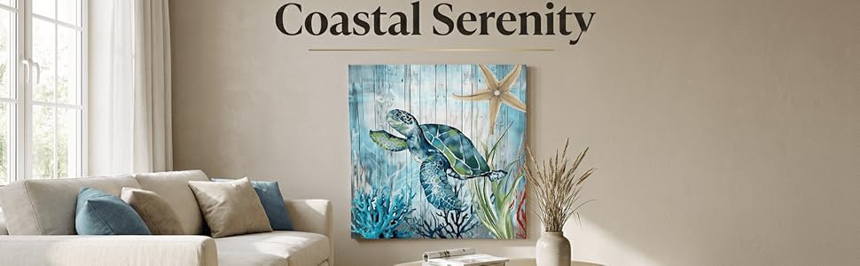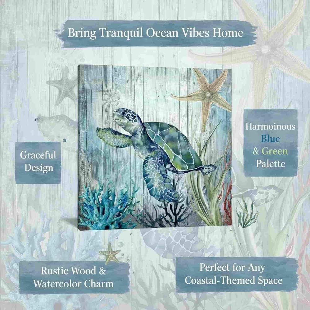 • أجواء المحيط الهادئة (ديكور السلحفاة البحرية): سلحفاة بحرية أنيقة وأمواج مائية ناعمة على حبيبات خشبية عتيقة - اللون الأزرق/الأخضر هادئ مثل الساحل. ديكور حائط فني من القماش الهادئ من أجل الهدوء اليومي أو على شاطئ البحر. وخاصة ديكور الحمام المحيط.