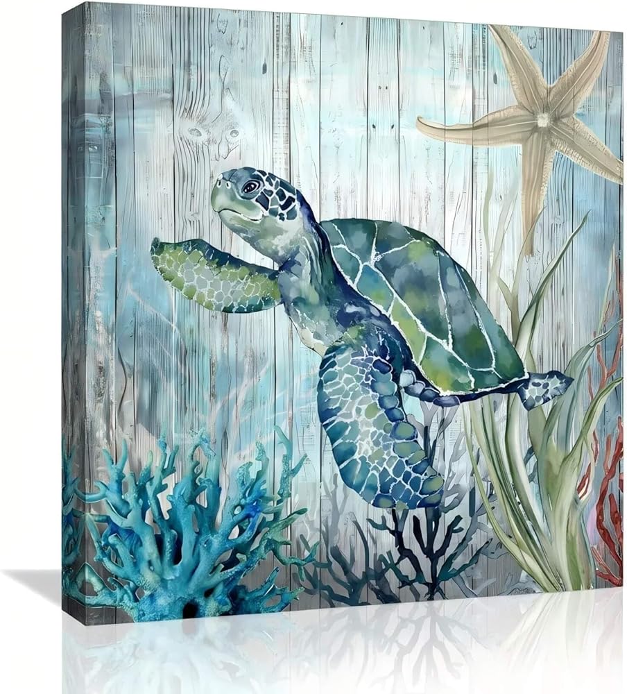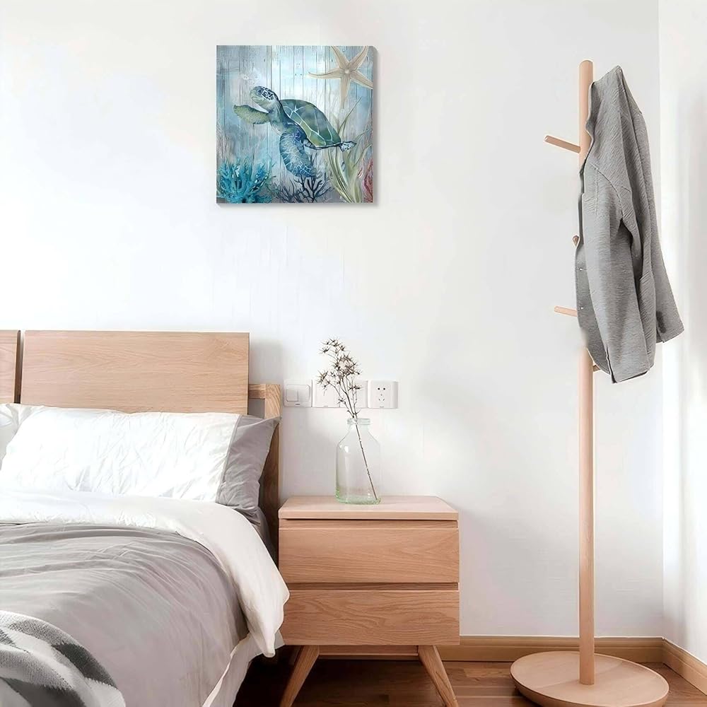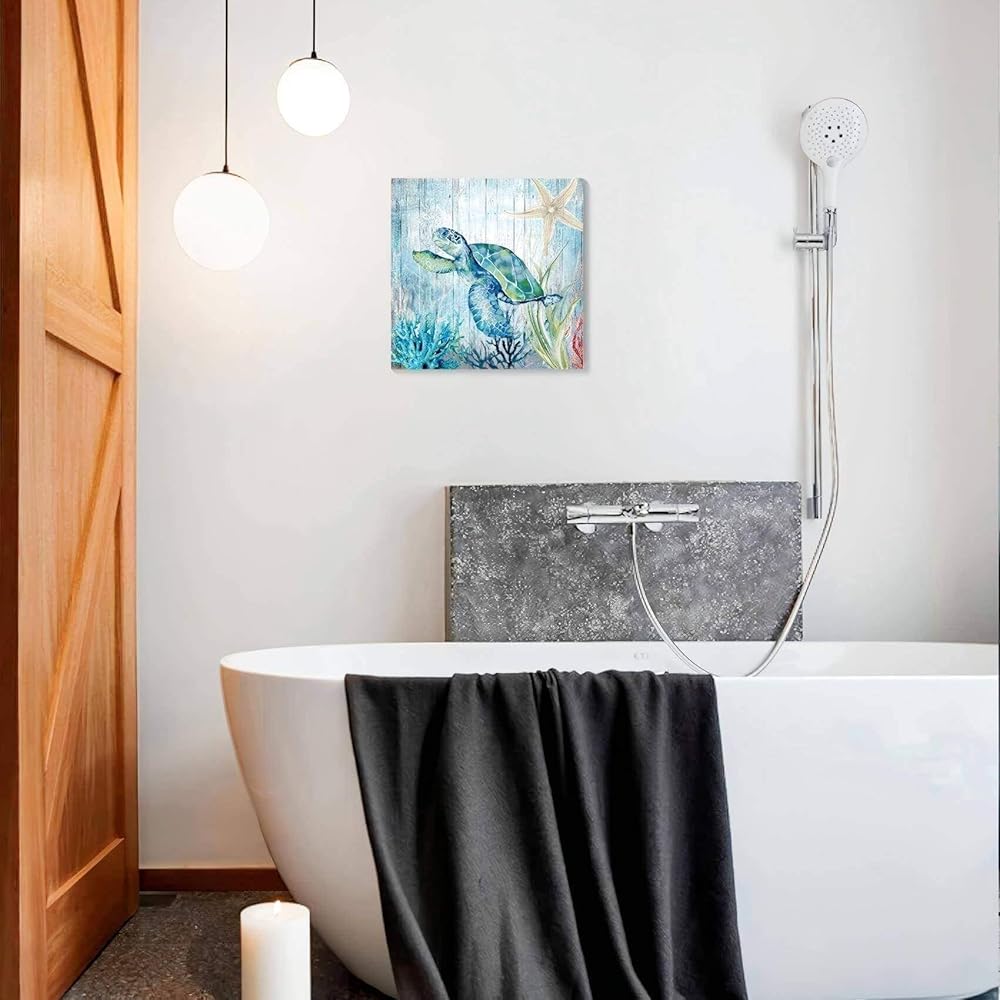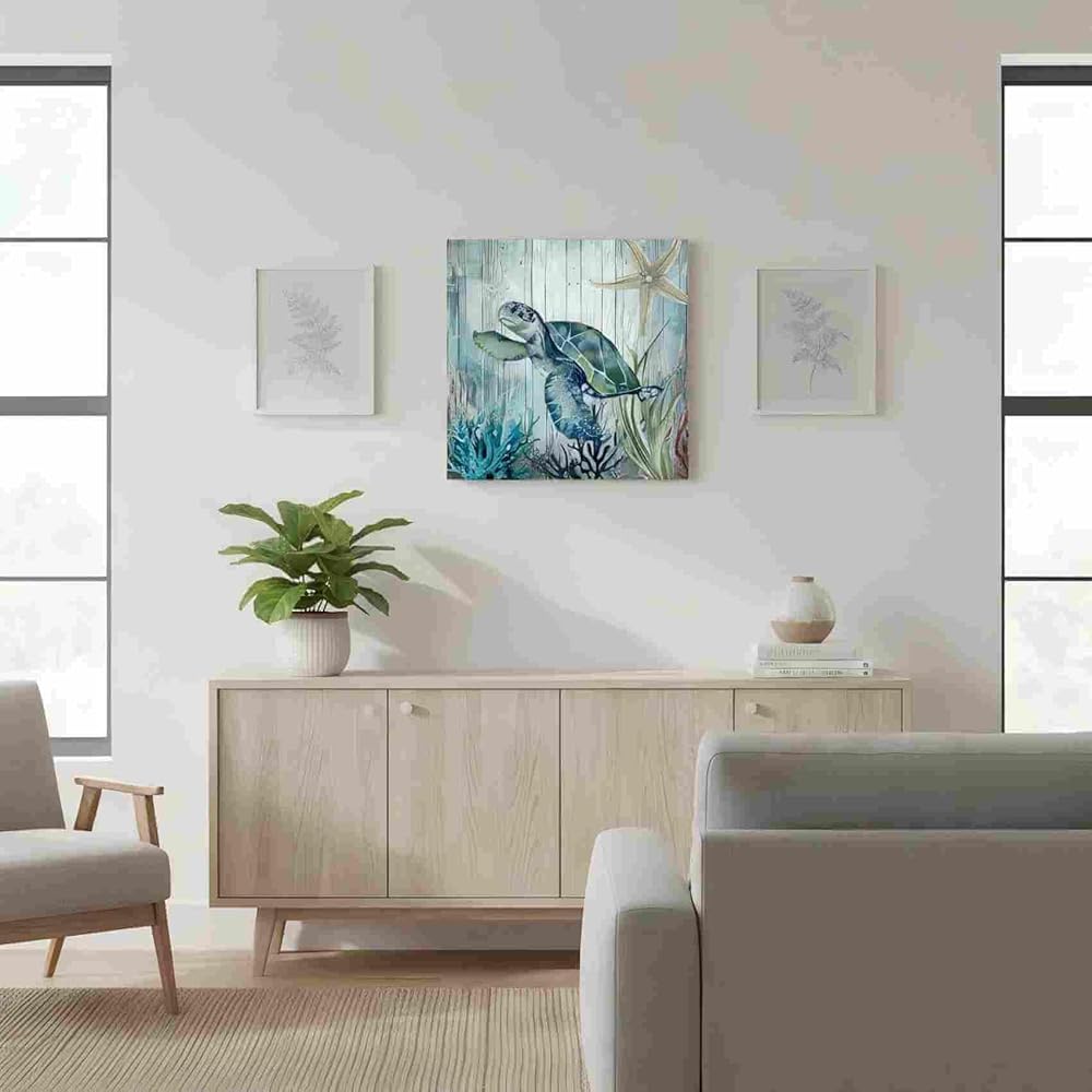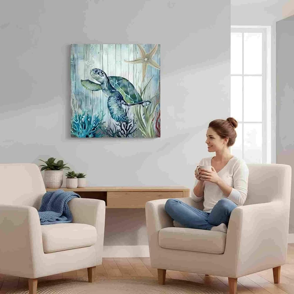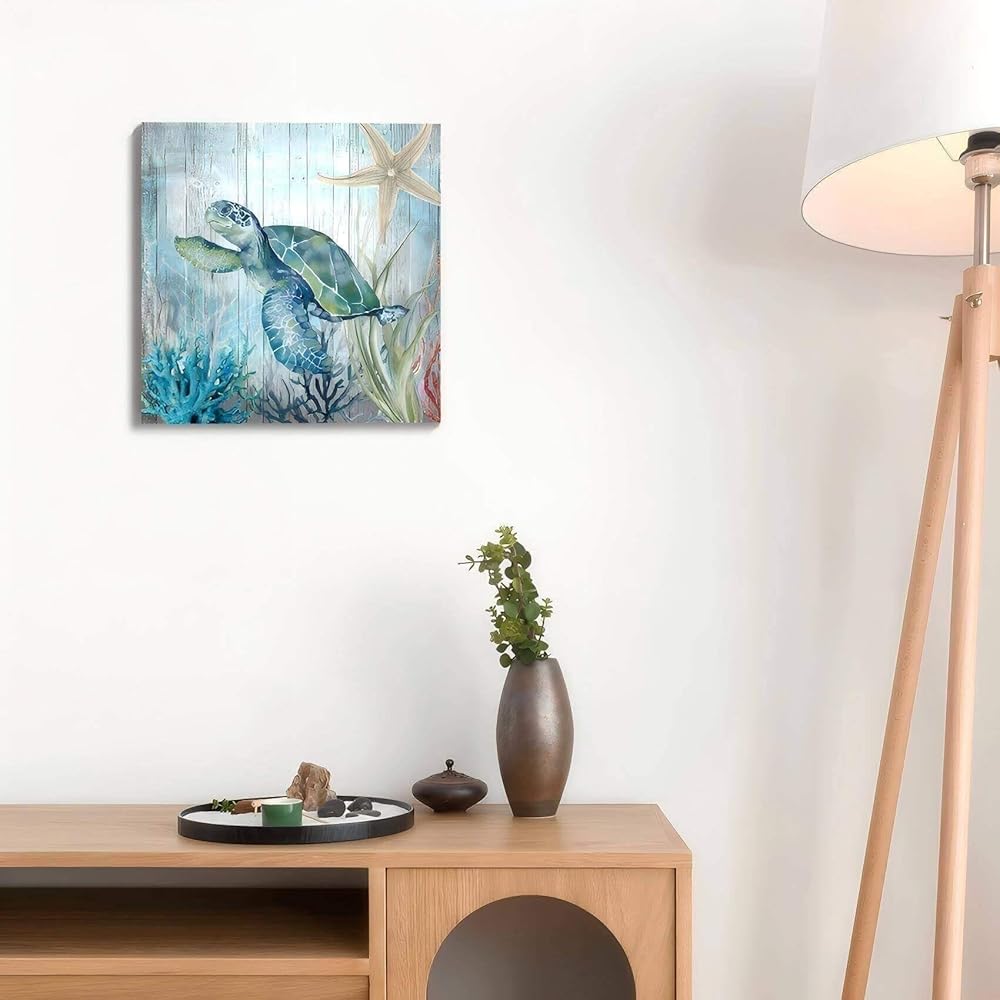 صور ديكور سلحفاة البحر لغرفة النوم والحمام وديكور الحائط الحديث على قماش الفن المحيط موضوع اللوحة صور الفن 14 × 14 بوصة مناسبة للمكتب/المطبخ صورة مؤطرة مقاومة للماء